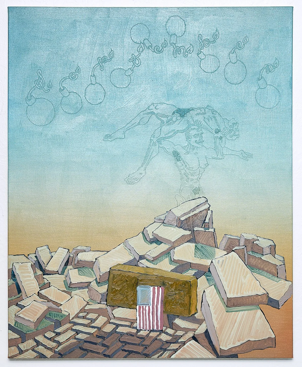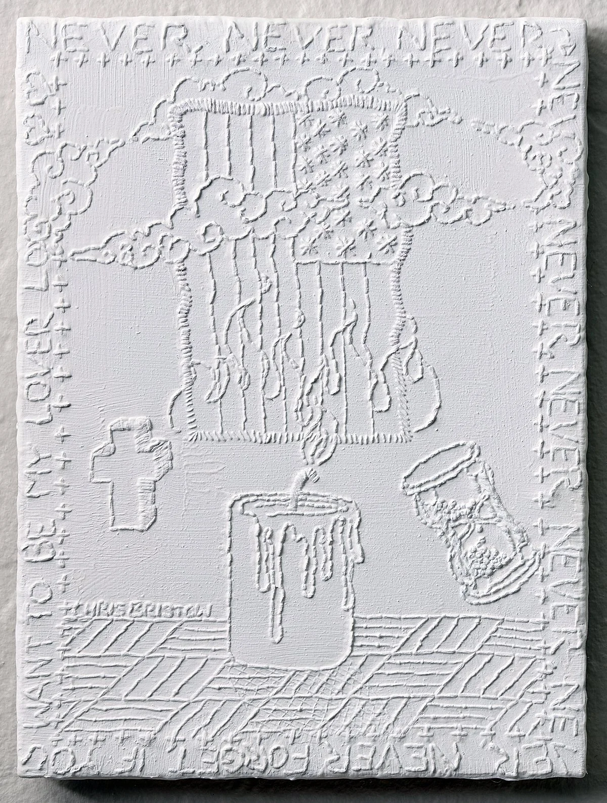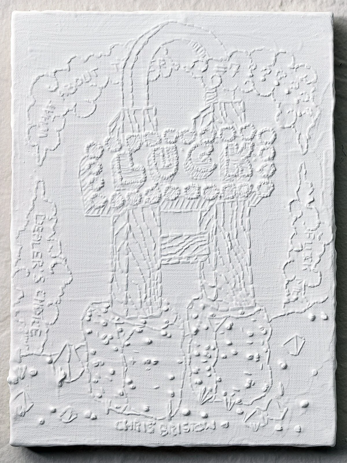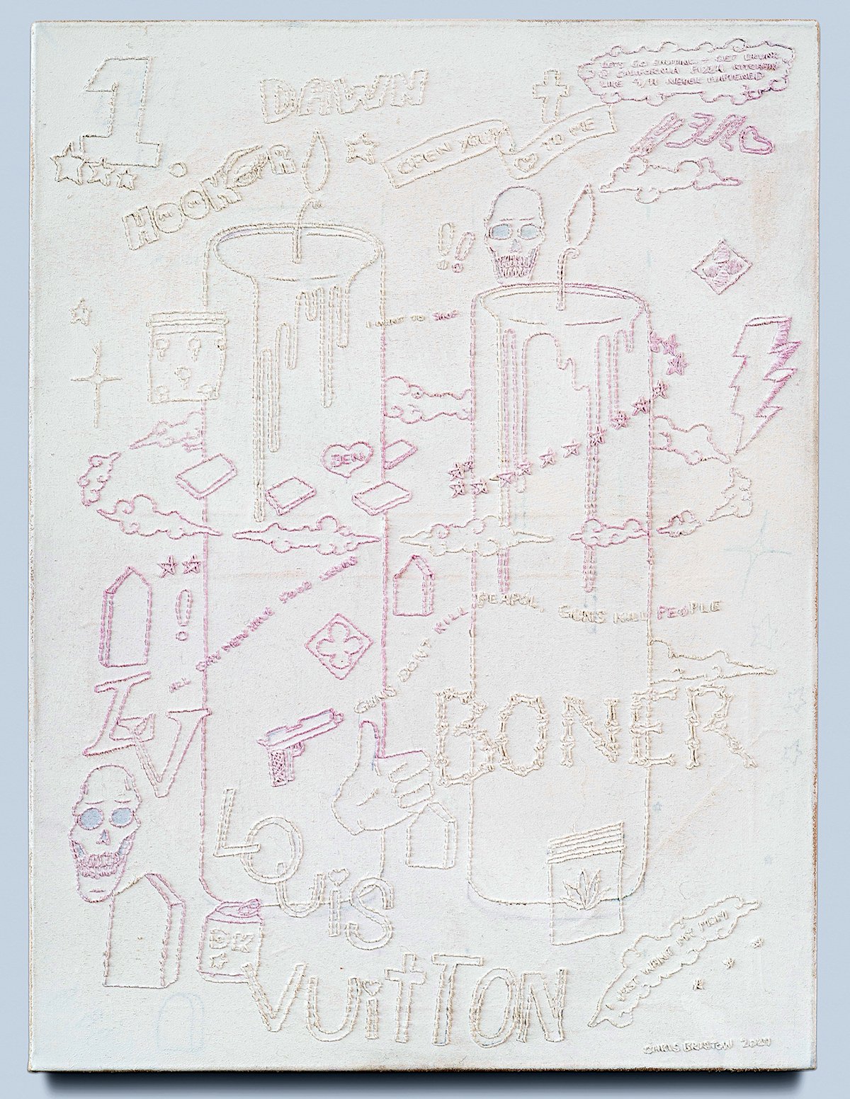 A column candle à la Pottery Barn ignites a floating American flag. Caricatured flames crawl up the fabric, as they might up the bicep of a biker. A blocky cross floats off to the left, an hourglass to the right. All the drawing in this work Bristow does with a needle. He then covers the stitches uniformly in white gesso, producing a monochrome painting. This reductive overlay makes the forms feel like a tattoo flash sheet or even your high school binder—are these things free-associated? From cross to flag to fire to time? Do these symbols run through the millennial mind, like the lyrics, “if you wanna be my lover”? Cross, flag, fire, time; stitch after stitch after stitch?