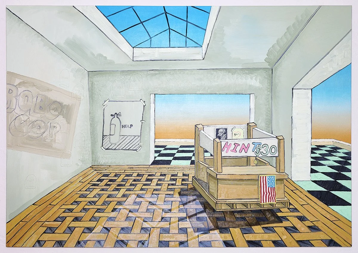 For instance, his painting Mother II depicts a large and mostly empty room that opens out onto a terrace. A skylight above and the two open doorways let in a sunset glow of orange fading into intense blue. The paint handling is generous and luscious, the enjoyment in its brushstrokes seeping into the depicted space. The work references EarthBound, Bristow’s favorite video game, that was released for the SNES (Super Nintendo Entertainment System) in 1994. [2] The room is expansive and enigmatic, still holding the artist’s signature references to pop culture, still crying out “help” in small text, and yet the space has a calmness to it. Bristow has made a space of his own that still has remnants of our maddening reality but carves out a respite for the artist and the viewer alike.