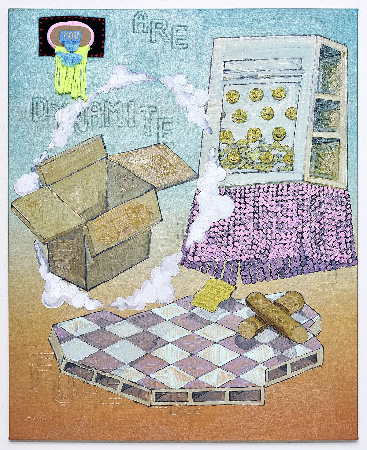 Chris Bristow, You are Dynamite, 2025, oil and embroidery on canvas with elements sewn from police uniforms, 40 x 34 inches. Image courtesy of the artist.