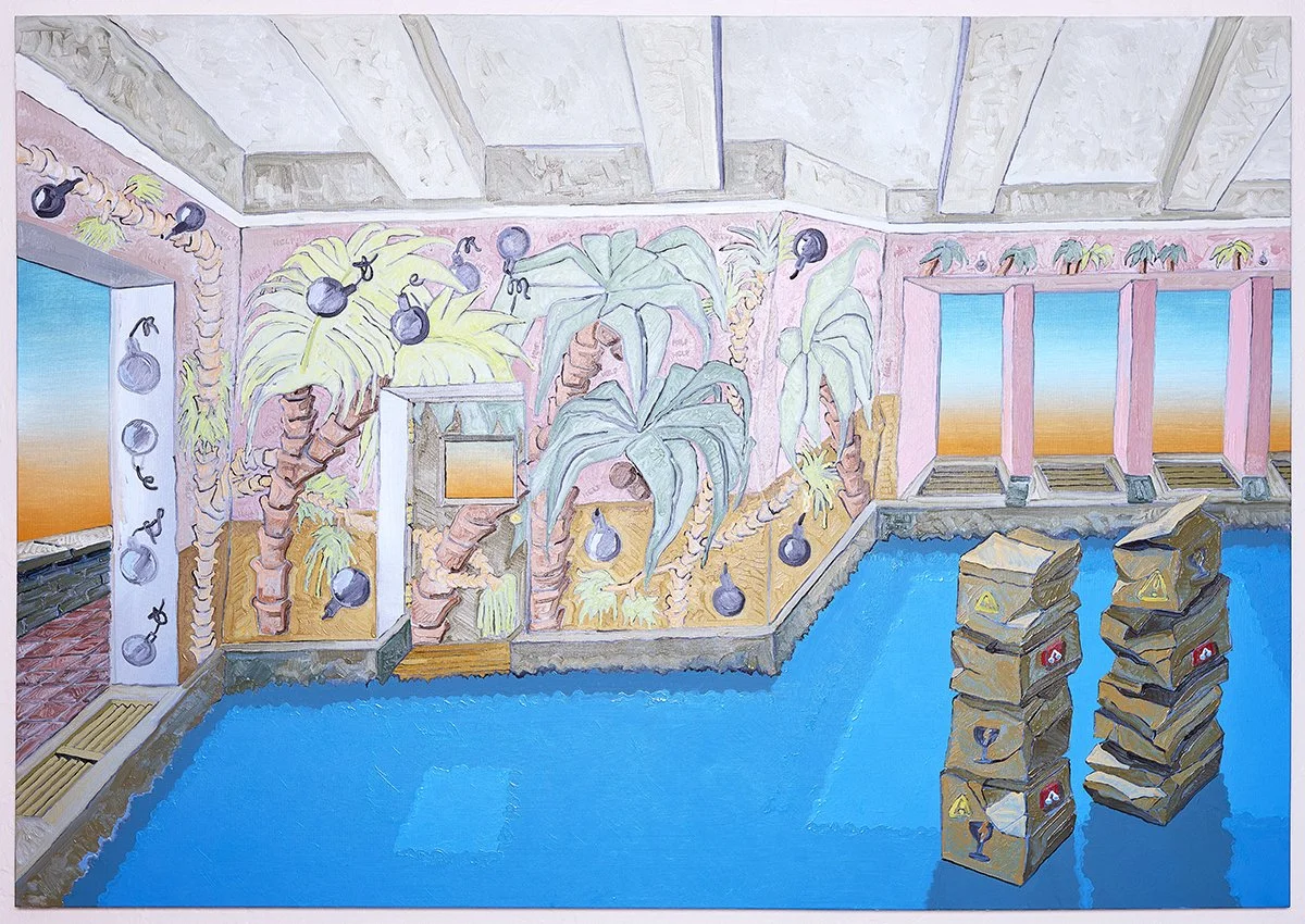 Turning from the disappointing landscape of our present moment, Bristow sometimes creates his own spaces within his paintings, which are entirely imagined. When speaking about his paintings, he asserts, “I do not use photo references in my work as I was always taught it creates a very flat painting if you simply look at or trace a photo onto canvas. I want to be a painter and not a photographer.” Instead of using photographs, Bristow often begins paintings with a drawing he then puts into Procreate. “The ability to create layers and edit on Procreate is transformative,” he says. Through using a digital tool, Bristow is not only creating an imagined space, he is world building.