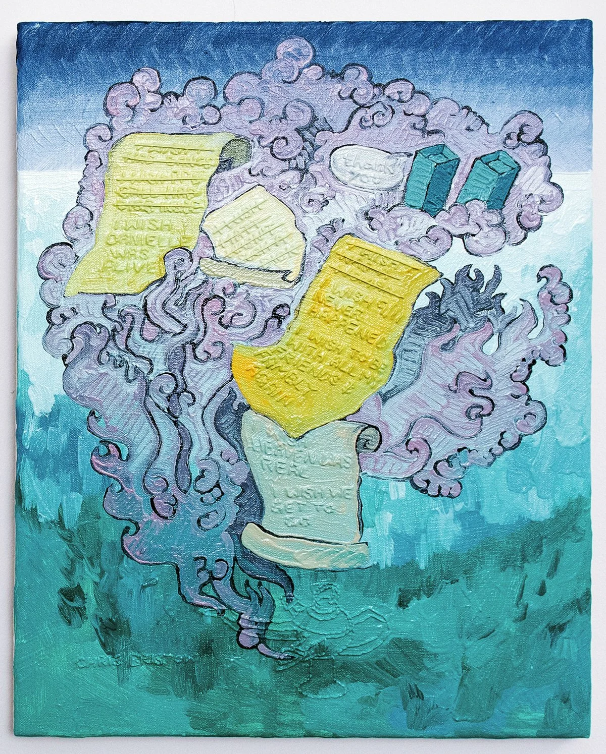 Chris Bristow, Three Wishes, 2025, oil and embroidery on canvas, 24 x 18 inches. Image by Erynn McConnell.