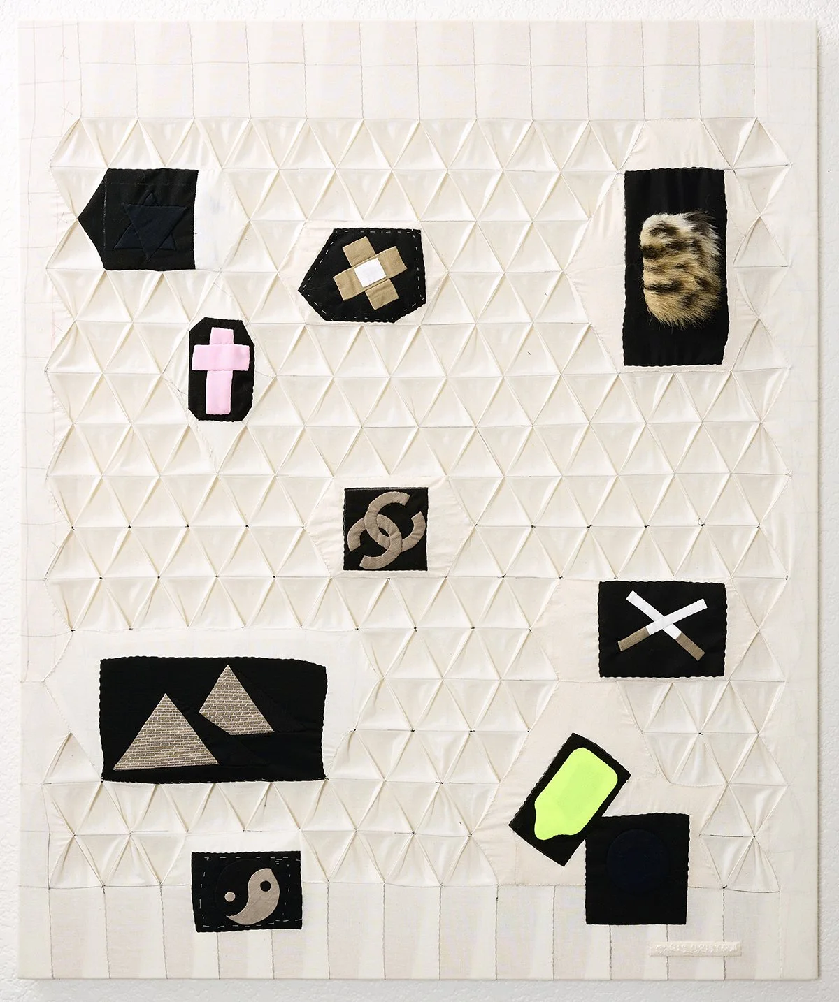 In Composite (Police Uniforms), Bristow produces a painting that is, in actuality, closer to a patchwork quilt than a painting. There is no paint—he creates the composition instead by piecing together muslin and scraps from police uniforms, as indicated in the title. Bristow pokes fun at the police and their pageantry by queering these uniform scraps: pulling the material out of context and adorning it with symbols. He uses many symbols over and over again across multiple works, plucking them out of the zeitgeist. They scatter across the patchworked surface: a yin-yang symbol, pyramids, cigarettes, the interlocking Chanel c’s, the Star of David, a cross, and a band-aid.