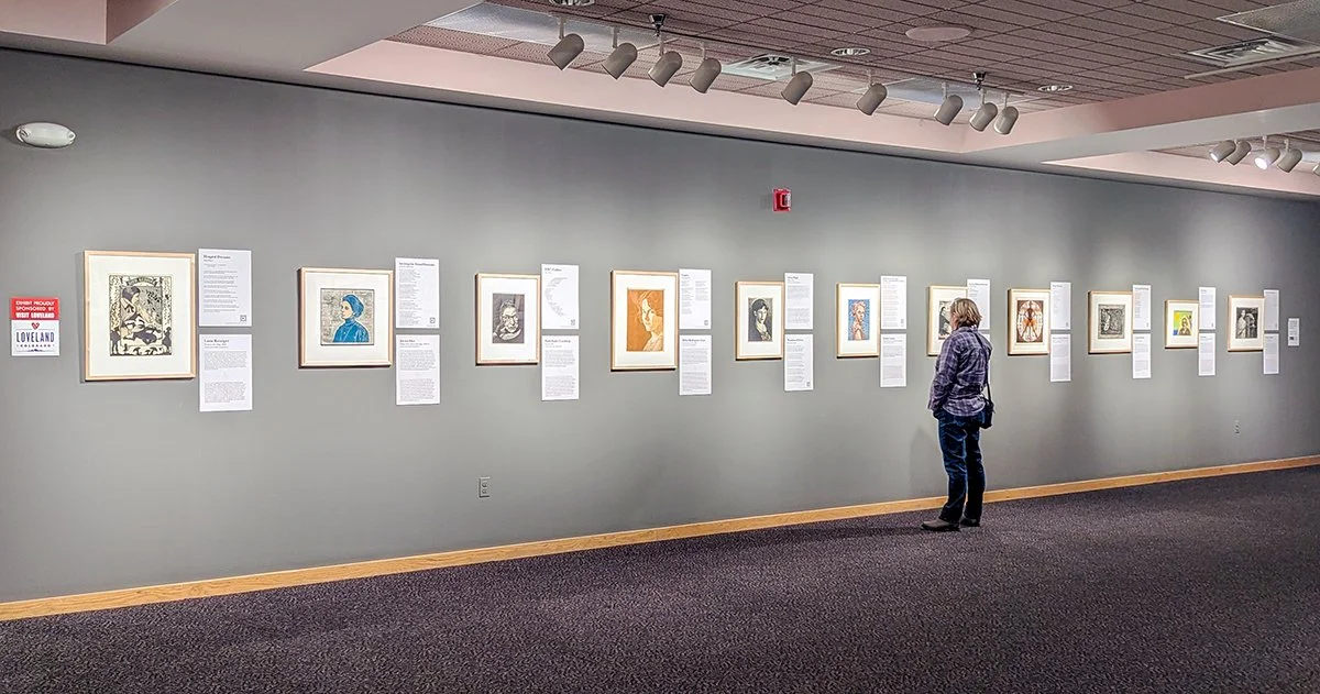 An installation view of Julie Lapping Rivera’s exhibition Look Again: Portraits of Daring Women at the Loveland Museum. Image by Raymundo Muñoz.