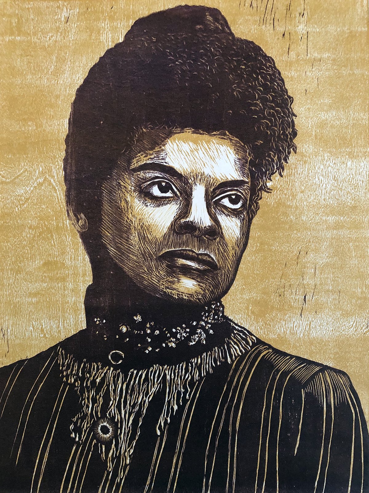Julie Lapping Rivera, Ida B. Wells, 2019, multiple block woodcut. Image courtesy of artist.