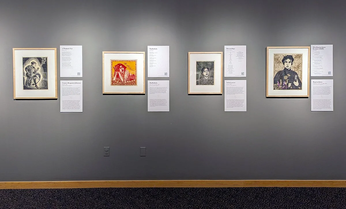 An installation view of works by Julie Lapping Rivera, from left to right: Frances Benjamin Johnson, Madhubala, Nella Larsen, and Regina Jonas. Image by Raymundo Muñoz.
