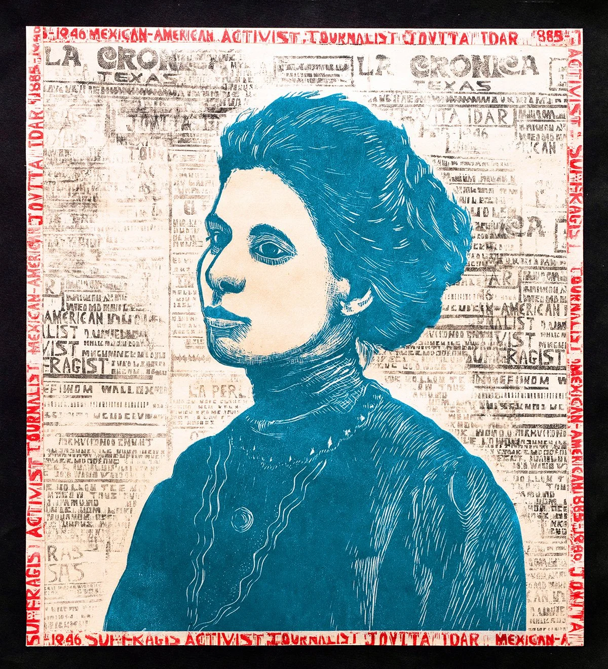 Julie Lapping Rivera, Jovita Idar, 2022–2024, multiple block woodcut with collage. Image courtesy of artist.