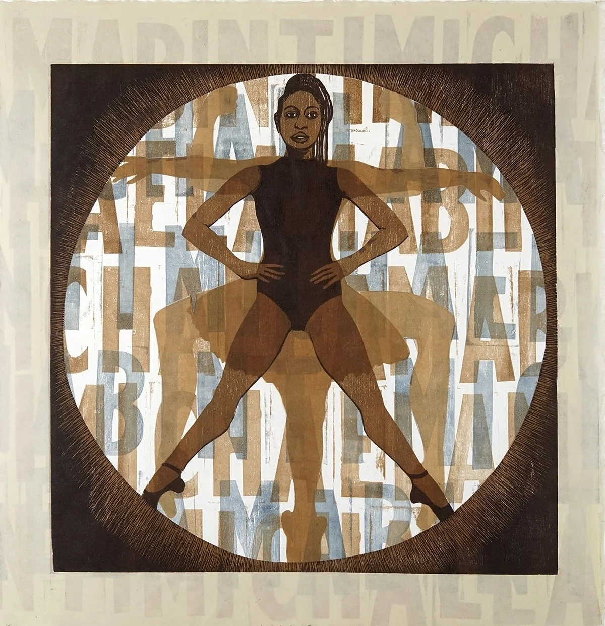 Julie Lapping Rivera, Michaela Mabinty DePrince, 2025, multiple block woodcut with collagraph with collage. Image courtesy of artist.