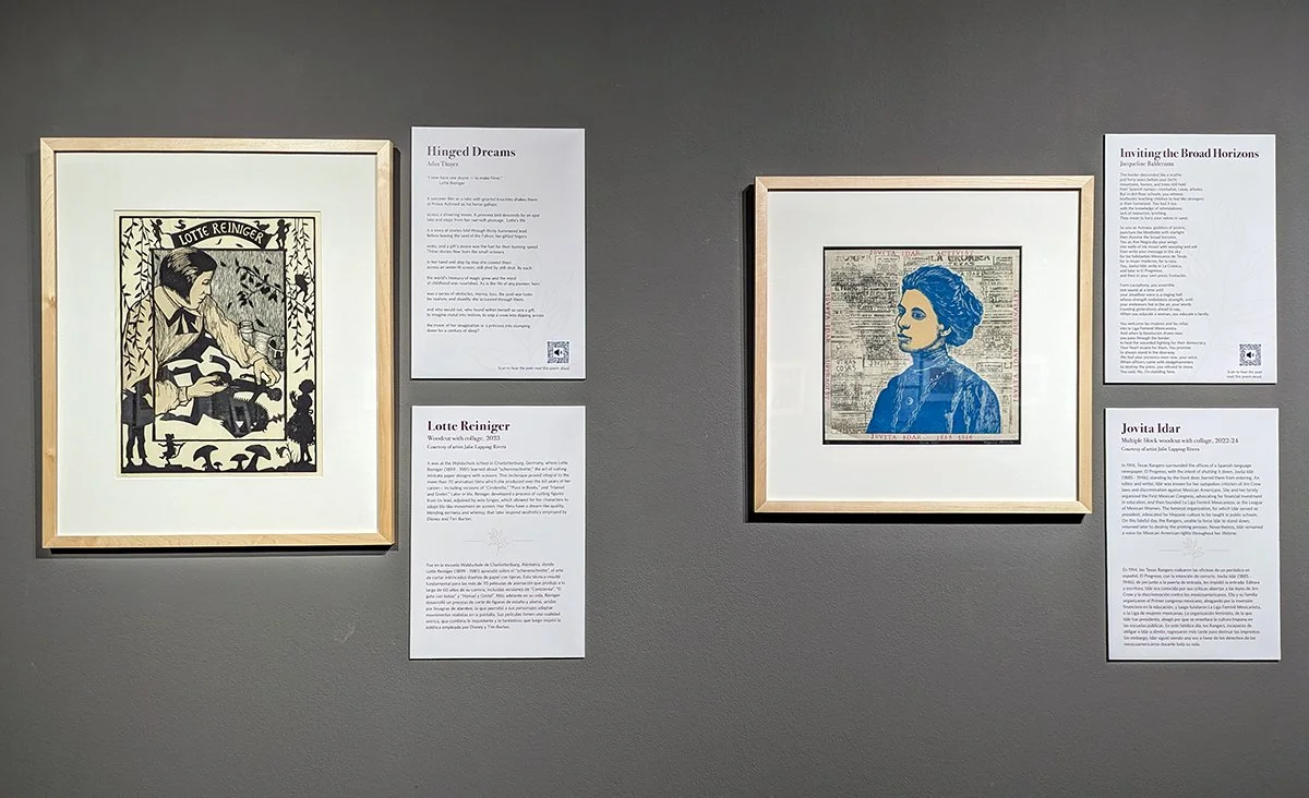 A view of works by Julie Lapping Rivera and the accompanying poems. On the left: Lotte Reiniger; on the right: Jovita Idar. Image by Raymundo Muñoz.