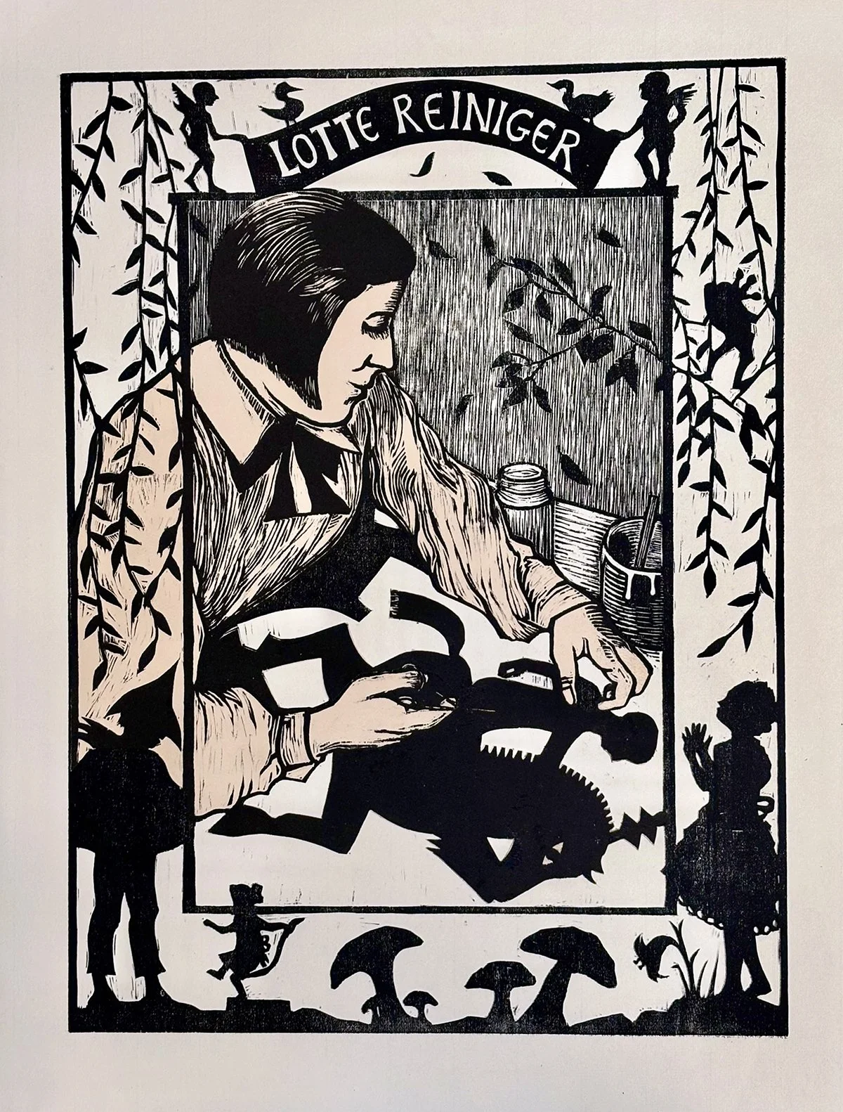 Julie Lapping Rivera, Lotte Reiniger, 2023, woodcut with collage. Image courtesy of artist.