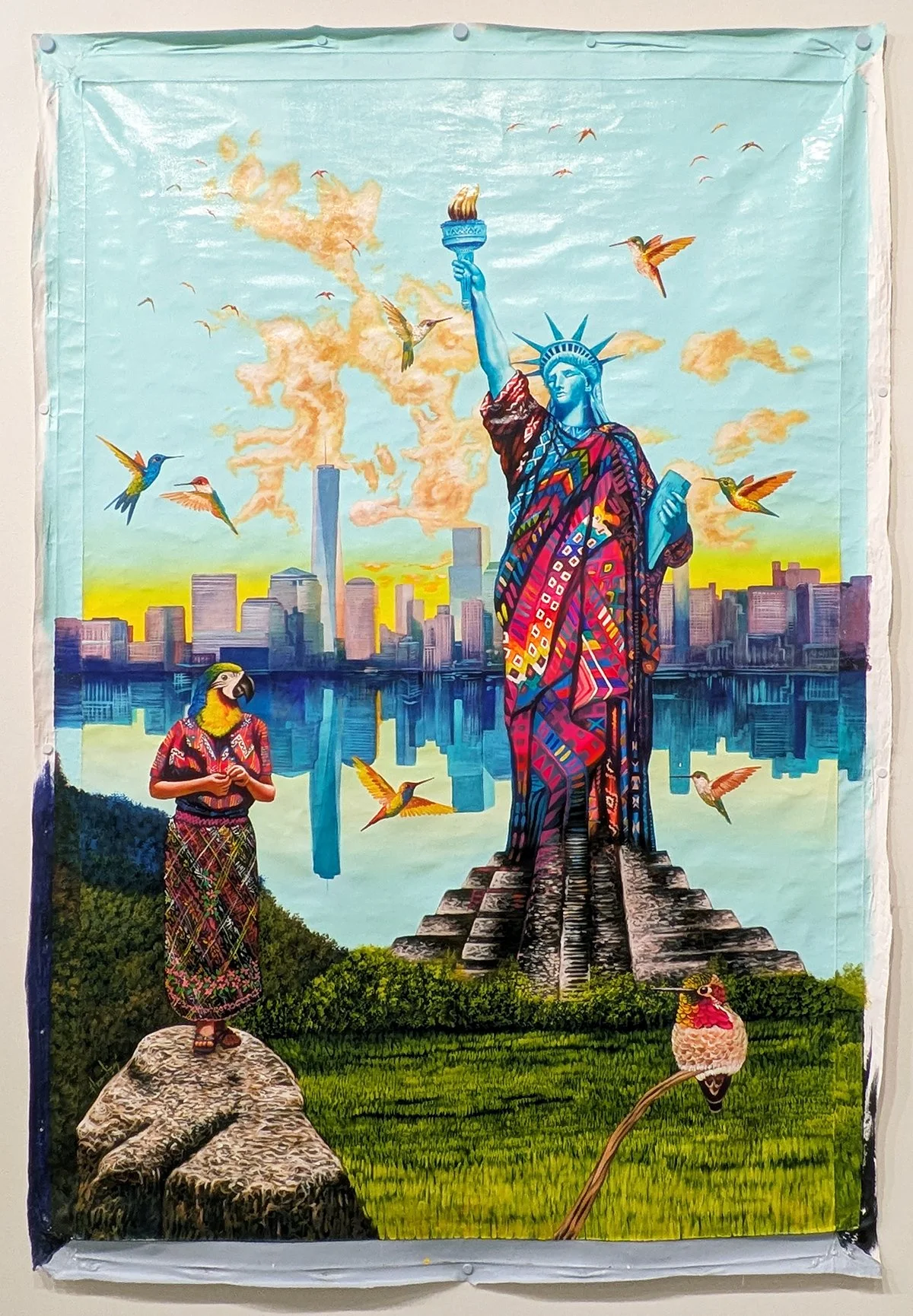 Emphasizing this connection, Yotz’s A New Colossus / Un nuevo coloso balances Paredes’ Conquistador on the opposite side of the gallery. Like Paredes, Yotz depicts a monumental figure—this time, the Statue of Liberty. The statue’s familiar flowing robes are replaced with bright, colorful woven Guatemalan fabrics. Hummingbirds hover around the statue, and in the bottom left foreground stands a bird-human hybrid, here representing a Maya person. The Statue of Liberty stands upon a stepped pyramid like those of ancient Maya cities.