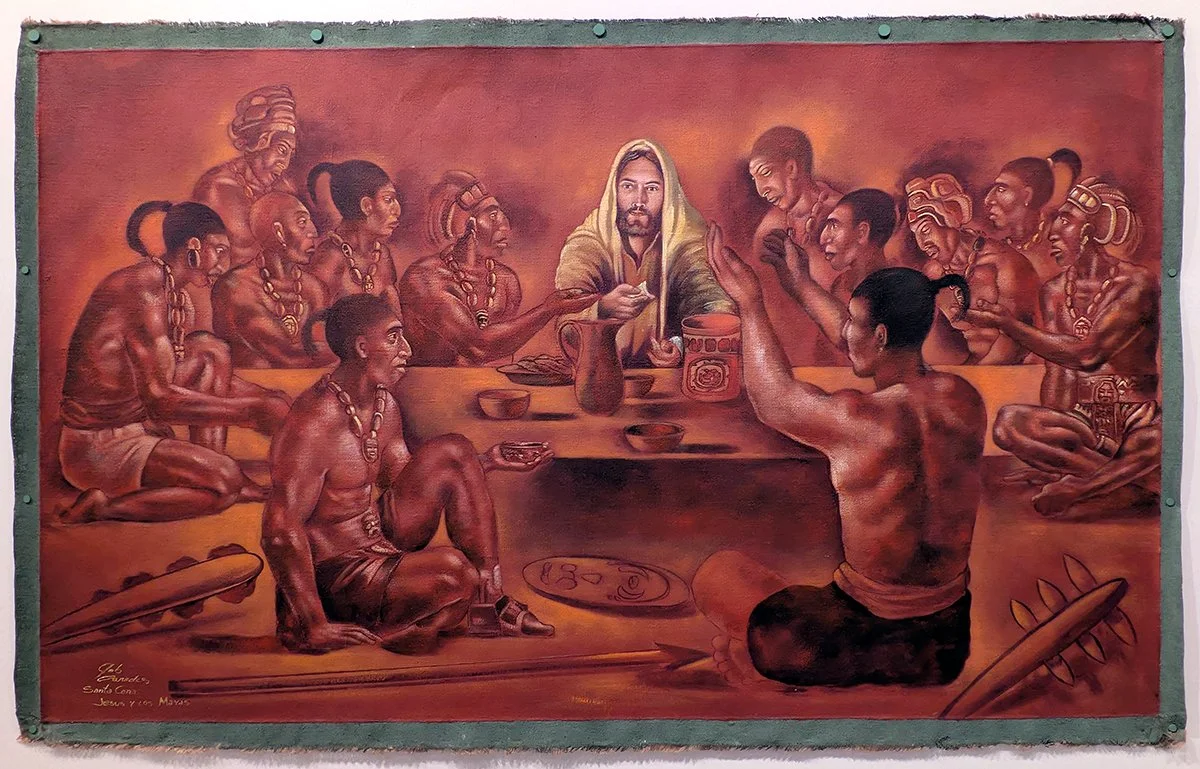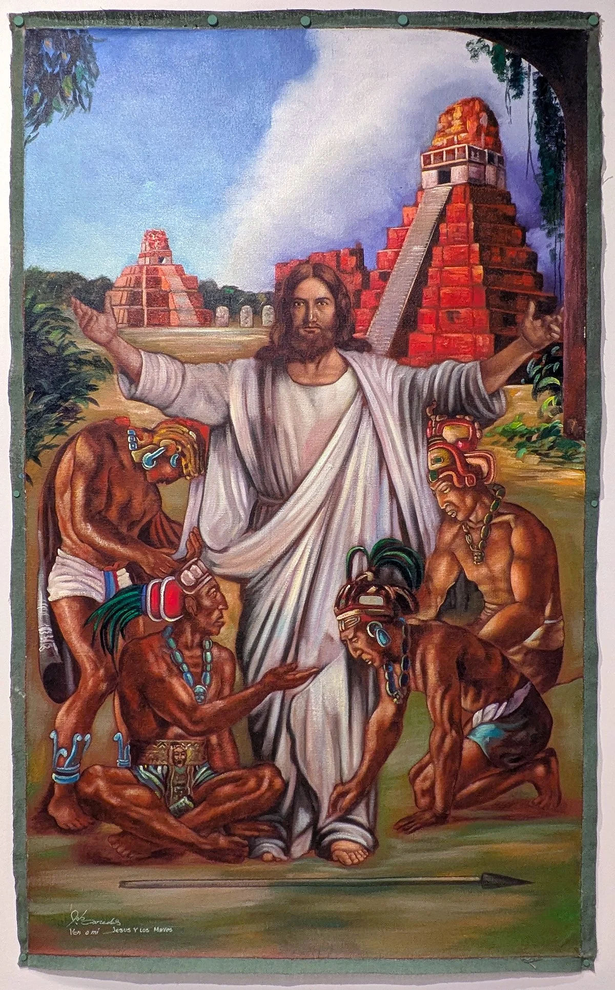The name of this painting suggests that Jesus is an imposing figure standing above the Maya figures, who are all positioned in reverent stances. Here, the Maya men exist in close proximity and connection to Jesus, as his disciples would be; however, teachings that Indigenous peoples were inferior to European settlers were used to assert ideas of racial and religious superiority, which in turn reinforced the oppression of the Maya peoples. The impact of the conversion of Indigenous peoples exists through the ongoing fusion and blending of Catholic rituals and teachings into traditional Maya religious practices. [6]