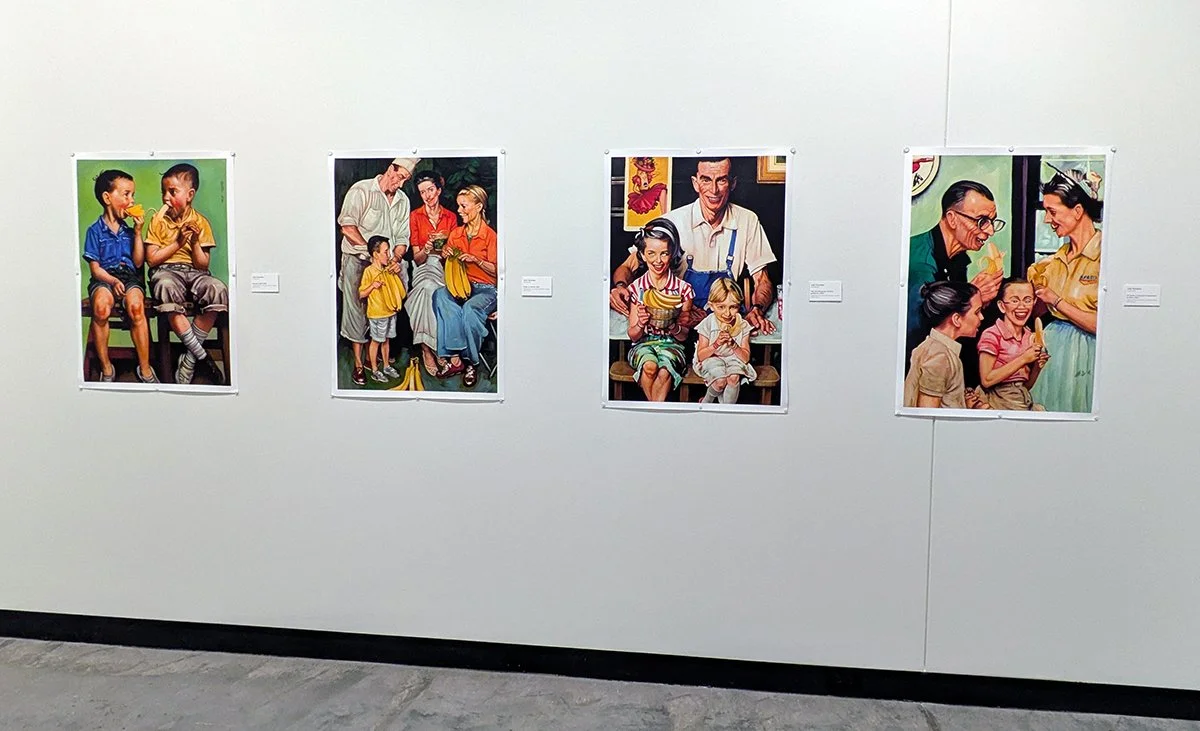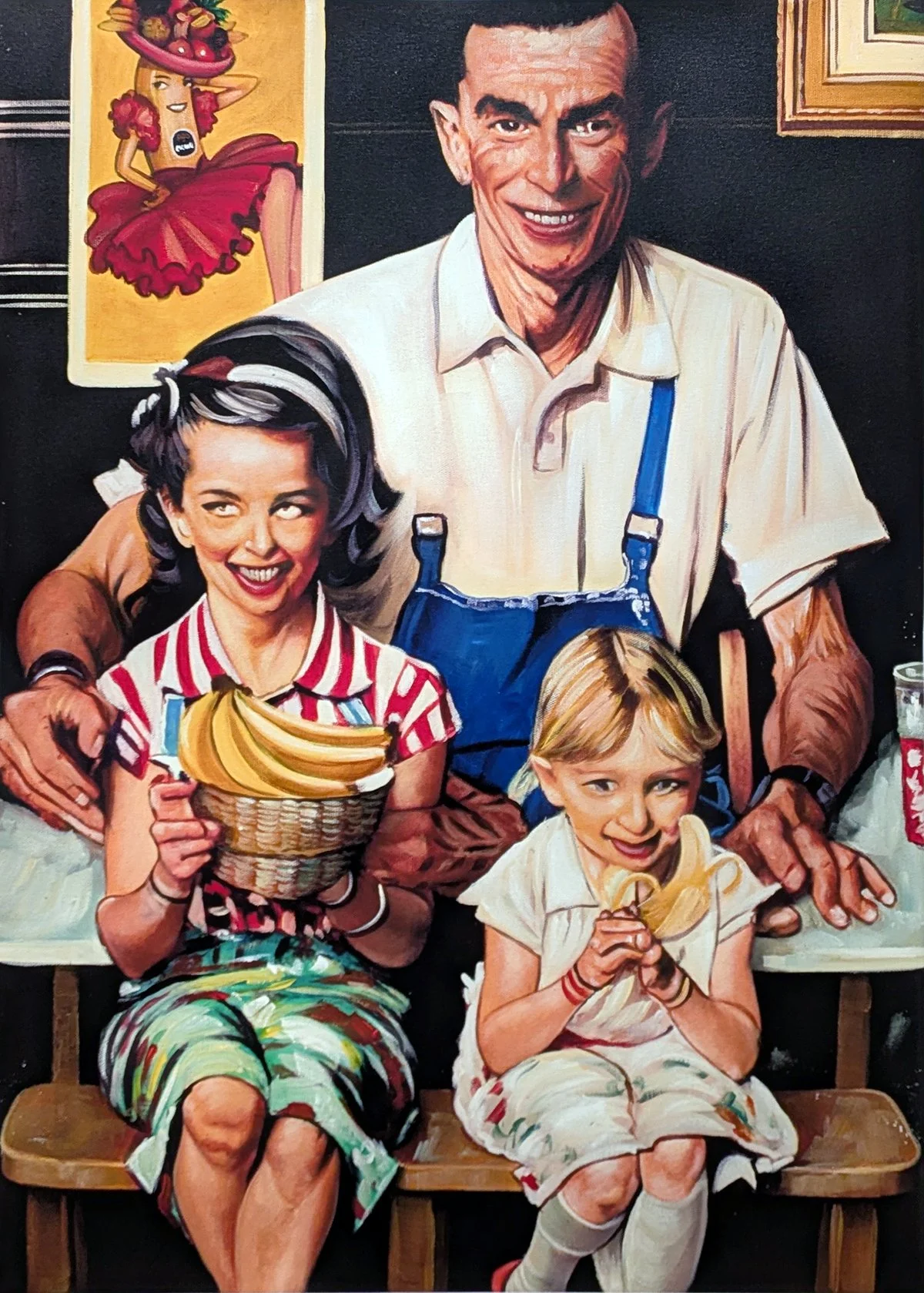 In this section, Paredes takes what seems like stereotypical, “all-American” images of happy families and transforms them into something more suspicious. I want to acknowledge that it is important to not view the unsettling nature of these images through ableism that others facial differences. When I was looking at these prints, I thought of the AI-generated images that have flooded the internet, in which it seems like the machine cannot create an actual human image and instead produces something within the uncanny valley. It seems like Paredes is trying to tap into a sense of irreality, which underscores the propaganda of the ideal American family and suggests that insidious forces perpetuate that image. Each print features a banana, and in We Are Bananas / Somos plátanos, a Chiquita banana poster hangs in the background, signifying the United Fruit Company's constant presence over these scenes.