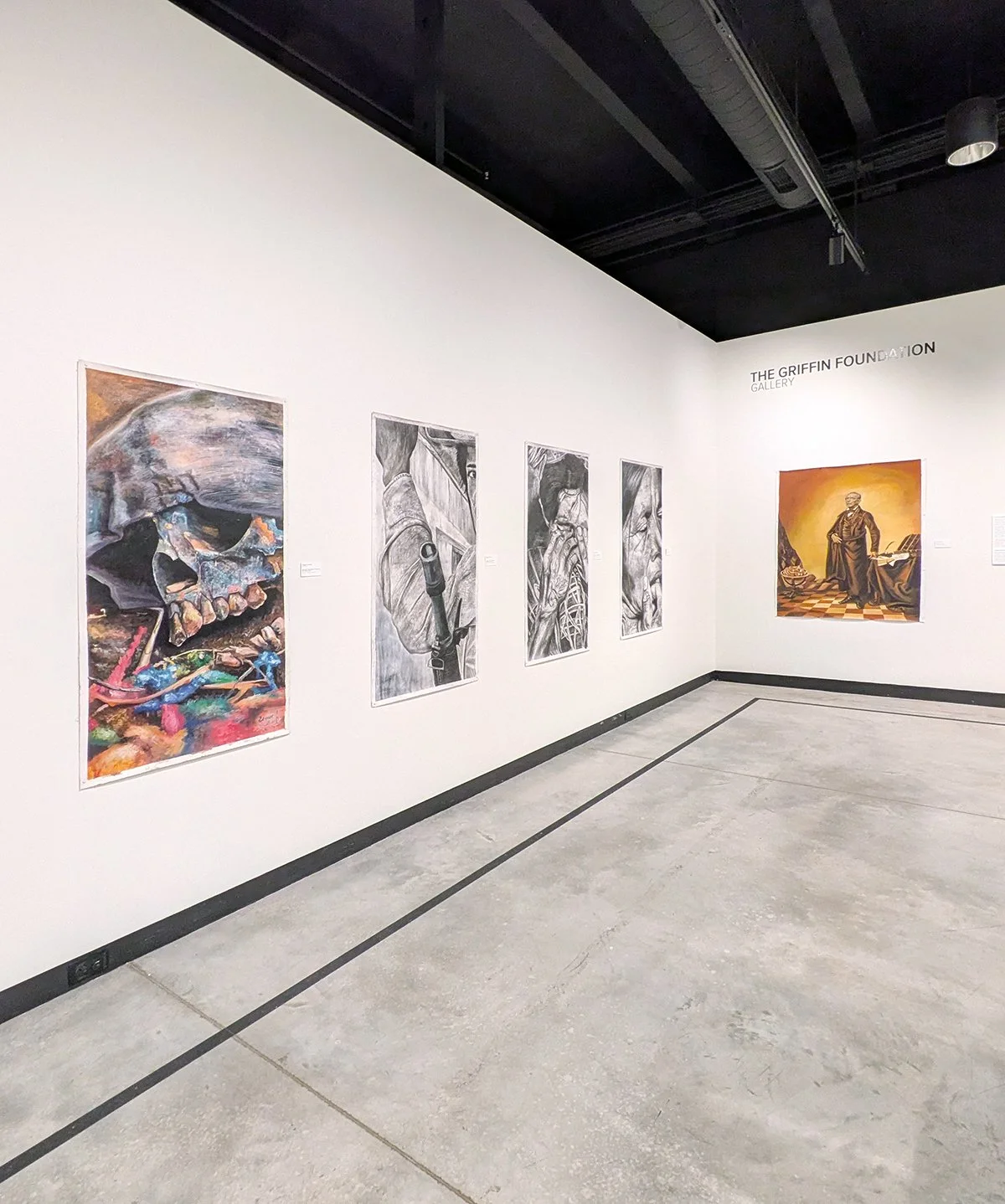 An installation view of Edgar Fuentes, Because I Was Maya / Porque yo era maya, 2023, oil on canvas; Died Trying to Live / Murió intentando vivir, 2023, charcoal on canvas; Because I Too Am Maya / Porque yo también soy maya, 2023, charcoal on canvas; and Because I Am Maya / Porque soy maya, 2023, charcoal on canvas. Image by Maggie Sava.