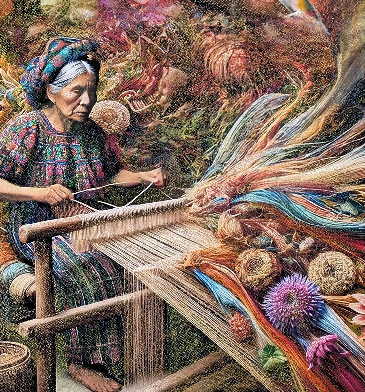 At the bottom of Tz’utuii K’aslem (Woven Life), Rodas shows an older woman sitting at a loom, weaving. The movement of the fibers makes it seem as if she's creating more than just cloth. It appears that she is incorporating the elements and energy around her into a greater creation, demonstrating Hoffert’s statement that Maya people “wove art into the fabric of their lives and identities—brilliant colors, geometric-natural forms in a broad scope of applications.” [3]
