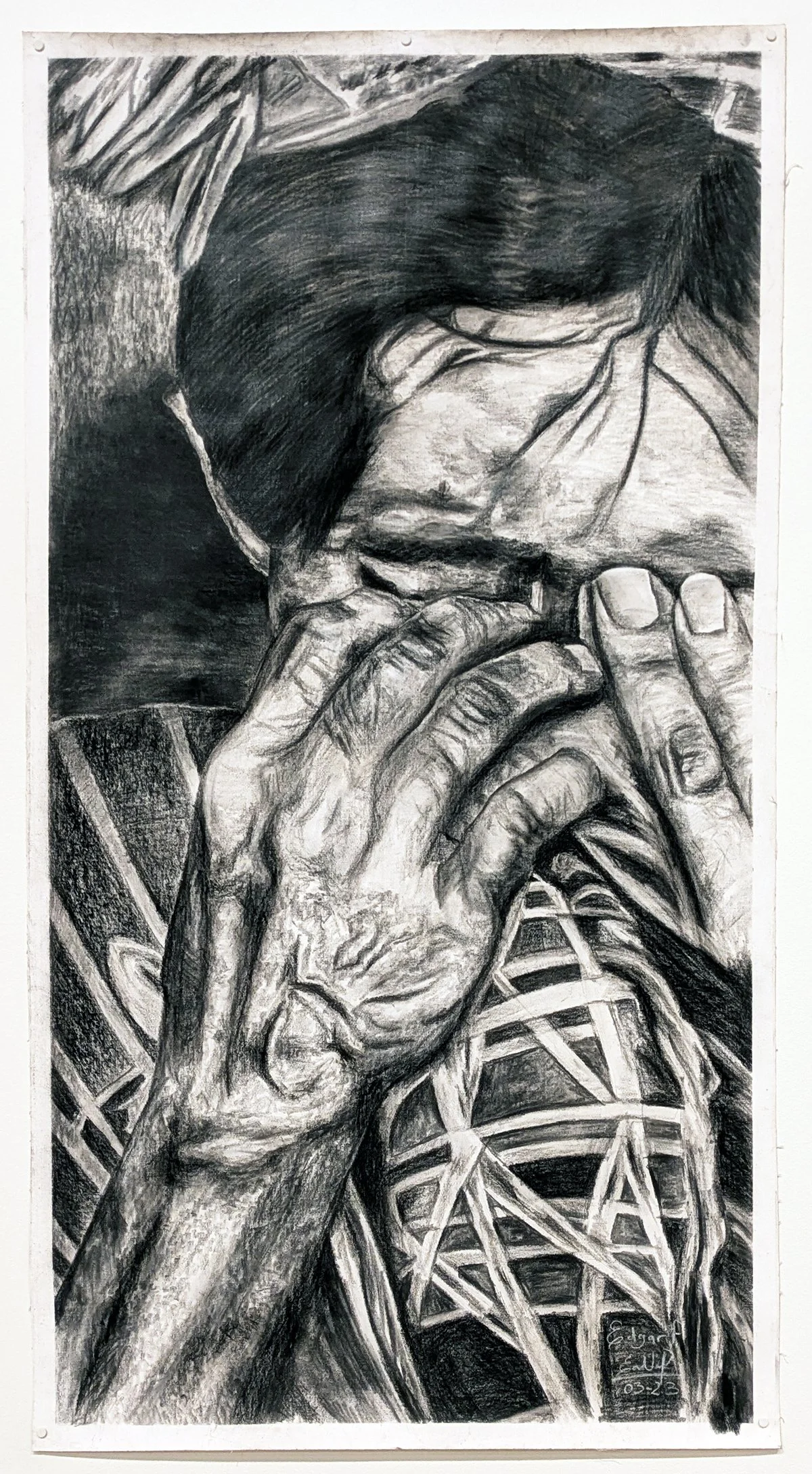Edgar Fuentes, Because I Too Am Maya / Porque yo también soy maya, 2023, charcoal on canvas. Image by Maggie Sava.