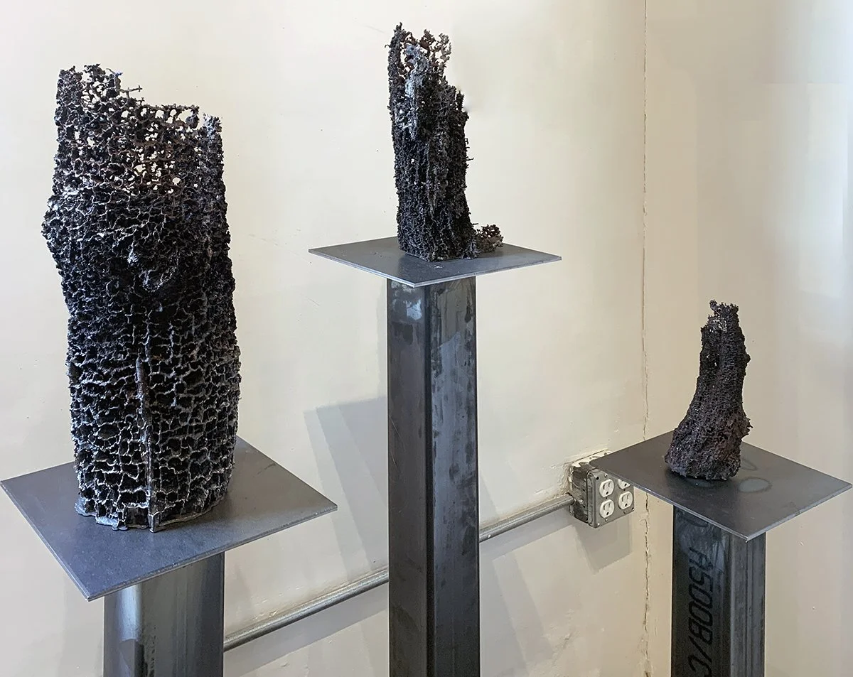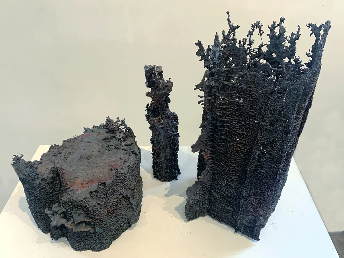 Three works by Christopher Meyer, from left to right: Scotch Pine, 2014-2024, performance-based cast iron, 20 x 18 inches; Root Bound, 2014-2024, performance-based cast iron, 14 x 14 inches; Buckthorn Small, 2014-2024, performance-based cast iron, 10 x 11 inches. Image by Parker Yamasaki.