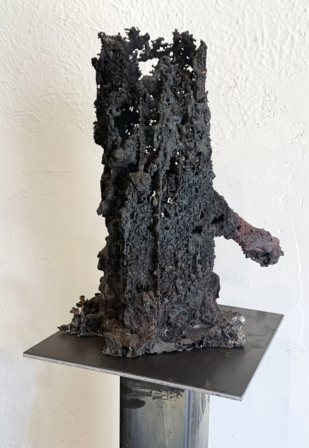 Standing among the paintings are the cast iron sculptures of Christopher Meyer in the exhibition How Soon We Forget. Meyer creates these works by pouring iron into a reactive mold—here, the molds are hollowed out tree logs—creating an eruption of fire and flares. When the show is over, what's left behind is the coarse, patinated shell of a stump.