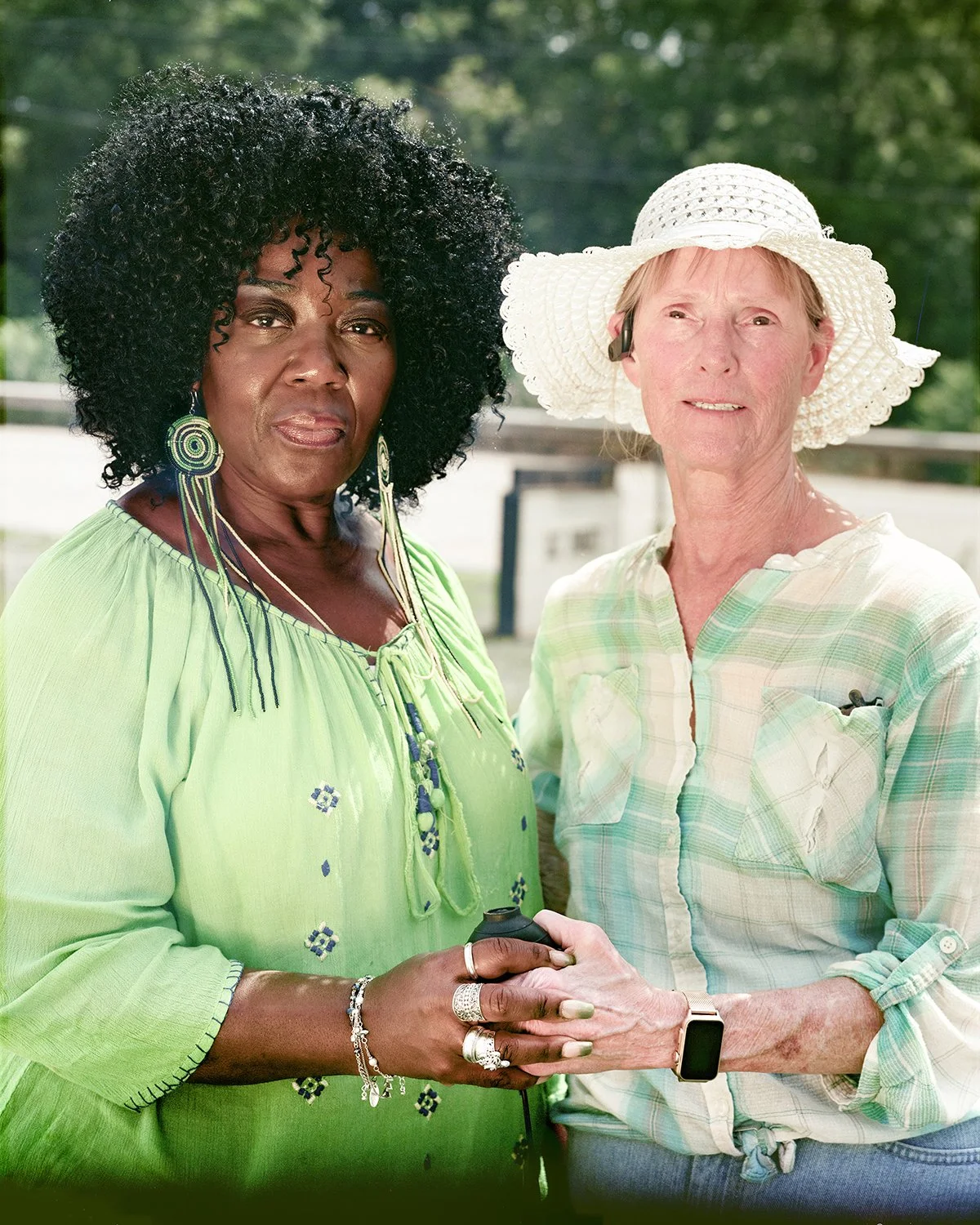 This mutuality is enacted and visible in a recurring motif: the use of a remote shutter release by the subjects of Suryajaya’s photographs. In Diego and Friends from Church, a school-age boy leisurely reclines in the foreground of the image, his fingers casually enveloping the shutter release bulb, its cable meandering across the grass, betwixt shoes for sale, and out of the frame in the lower right corner of the composition. In Faye and Debra, two women, one Black and one white, stand side-by-side, holding hands, their fingers woven together to clasp the shutter release bulb.