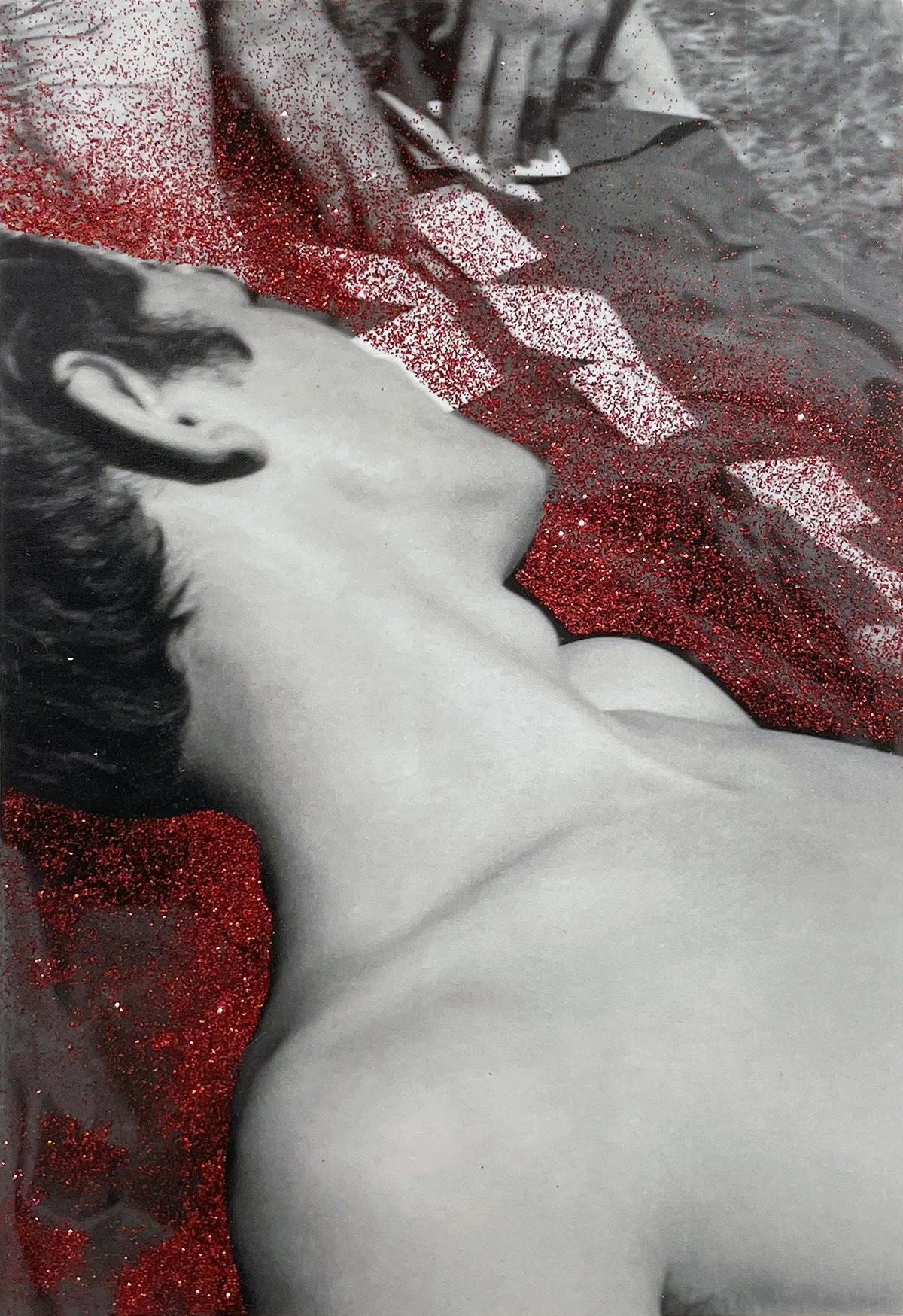 Applying glitter—iridescent flecks well-known for their persistence, proliferation, and stickiness—presents this image of homoeroticism as a beauty that grows despite forces that seek to limit it. The glitter is a metaphor for queer love and relationships that attest to and make possible a kind of sustenance systematically denied to queer people in homophobic society.