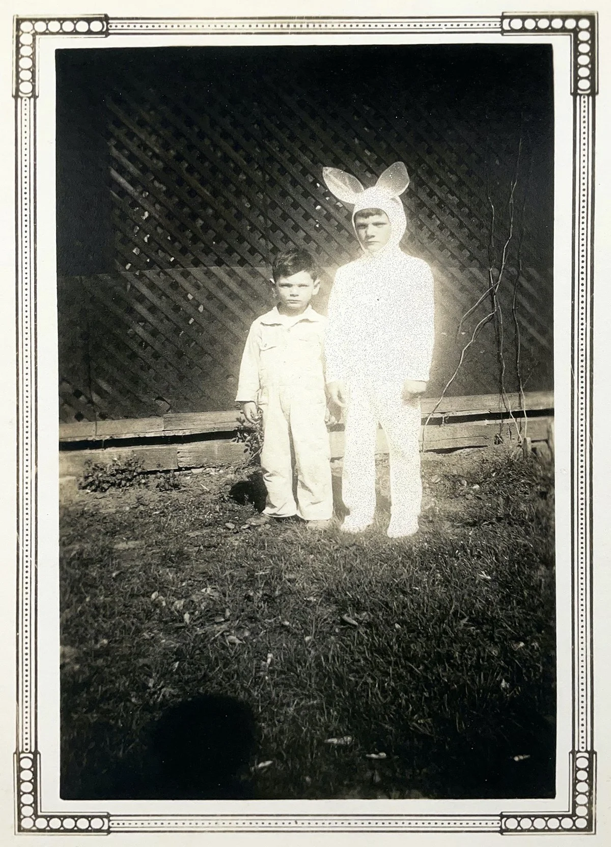Matthew Finley, Halloween, mom made our costumes. John and I must have been fighting, 2024, archival pigment print mounted to board with glitter and varnish, 18 x 22 inches framed, 4/10. Image by Nina Peterson.