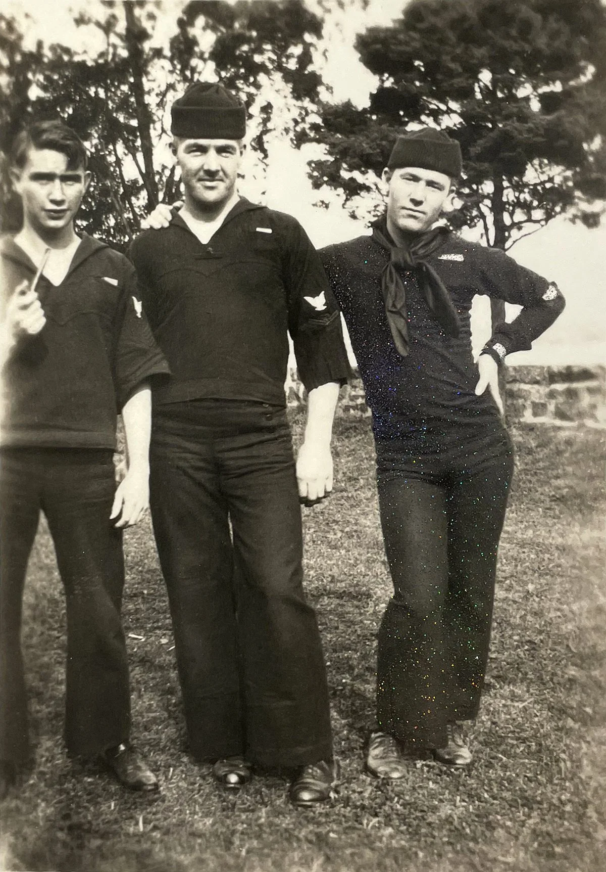 Finley’s choice to apply glitter to the uniform of the sailor on the right, who stands with a sassy hand on a popped hip, encodes the trio with the performative cues of gay culture, both masculinism and flamboyance. It invites us to see these military men as living in community and in love. Art historian Richard Meyer describes the relationship between hypermasculinity and flamboyance in mid-century gay culture, noting how “the relation between swaggering outlaws and flamboyant divas (between clone and camp styles) is not always an oppositional one but sometimes a subtle shift in costume or context.” [15]