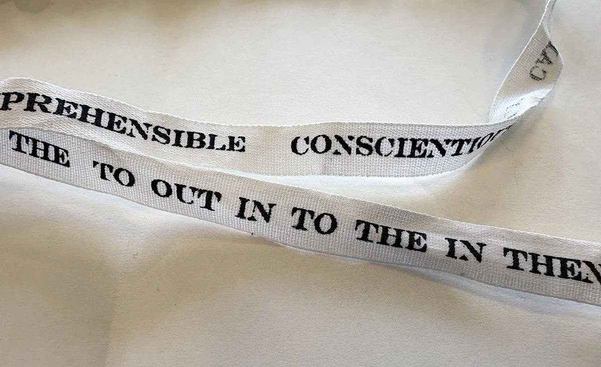 Joanna Kidd’s Knots similarly unwinds language into both literal and metaphorical threads, comparing the use of language with the act of knitting. In her sculptural text, Kidd constructs a ball of yarn out of strips of white fabric with text printed on it in black ink, which reveals more phrases as it unspools.