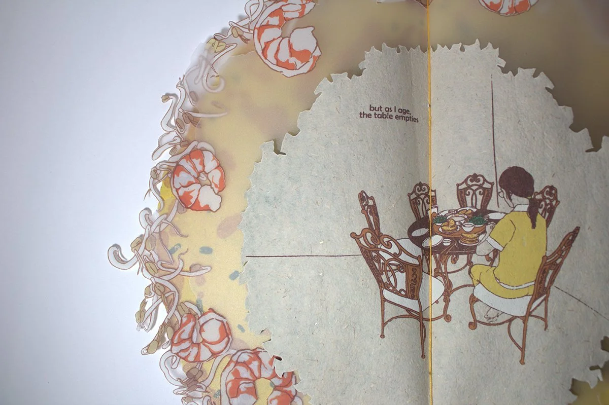 Similarly, Nguyen’s Bánh Xèo resembles the Vietnamese crepe of the same name. The book opens up to reveal interior pages framed by images of shrimp and bean sprouts. Peppered in at the center are leaves with text, one of which reads, “with the sole connection to our culture being at the table with us.” As the words convey, Nguyen is examining the essential role that food plays in passing down culture through families and different generations. The center fold of Bánh Xèo shows an illustration of a woman sitting alone at a table covered in plates of food. The text on the top left reads: “but as I age, the table empties.”