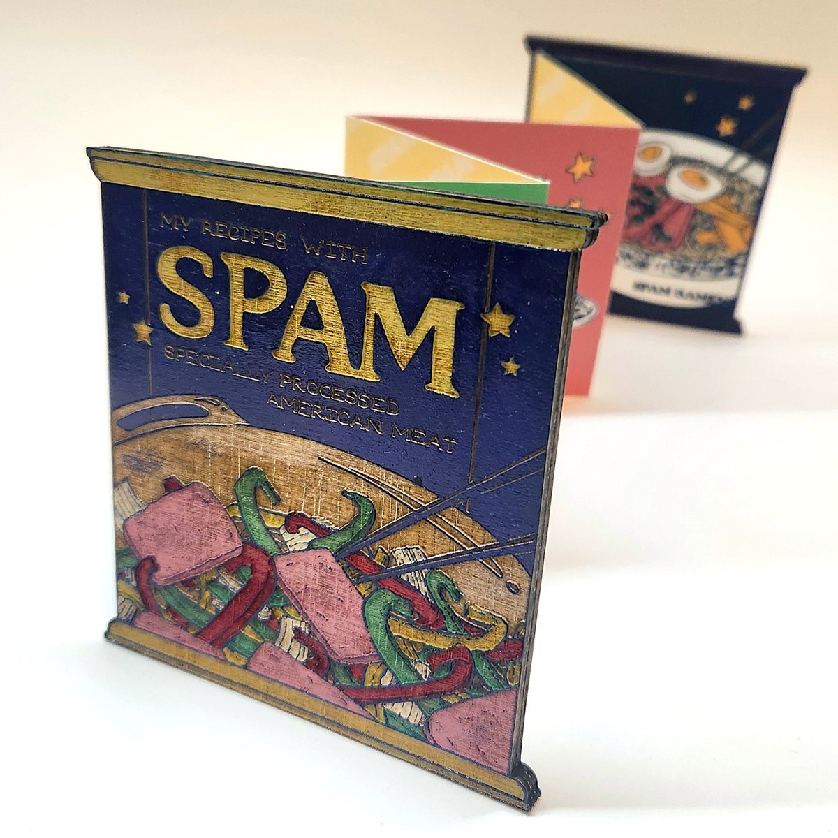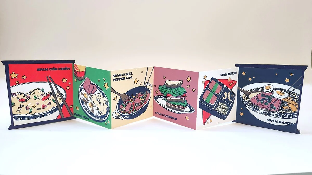 Taking the form of a SPAM® can with a wooden cover that bears the famous branding, Specially Processed American Meat folds out into accordion-style pages, each featuring common recipes made by Asian families using the canned meat. The pages include bright colors and illustrations of the dishes surrounded by cartoon stars.