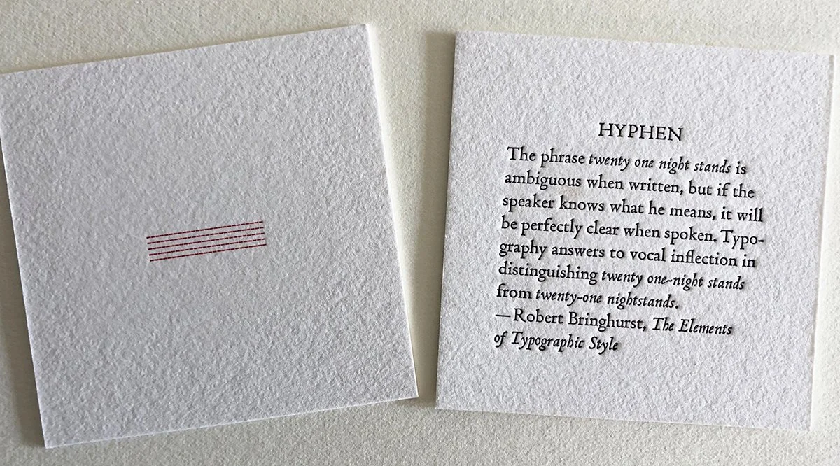 These cards call the viewer’s attention to the aesthetic role and function of semicolons, question marks, paragraph marks, and more, drawing a magnifying glass to how sentences in books are laid out through the art of typography and questioning when punctuation is superfluous to or necessary for clarity and understanding.