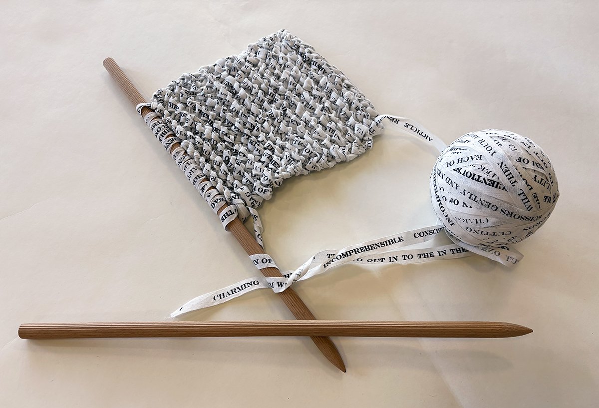 When woven together with the large wooden knitting needles, the individual words, like “incomprehensible,” “words cutting,” and “scissors gently,” have the potential to form new meanings in unique arrangements made by the stitches, much like the act of writing sentences to create paragraphs, which then form chapters, and so on and so forth. However, as they weave together, they appear to become obfuscated and harder to read, suggesting the always possible failure of language and the space for miscommunication.