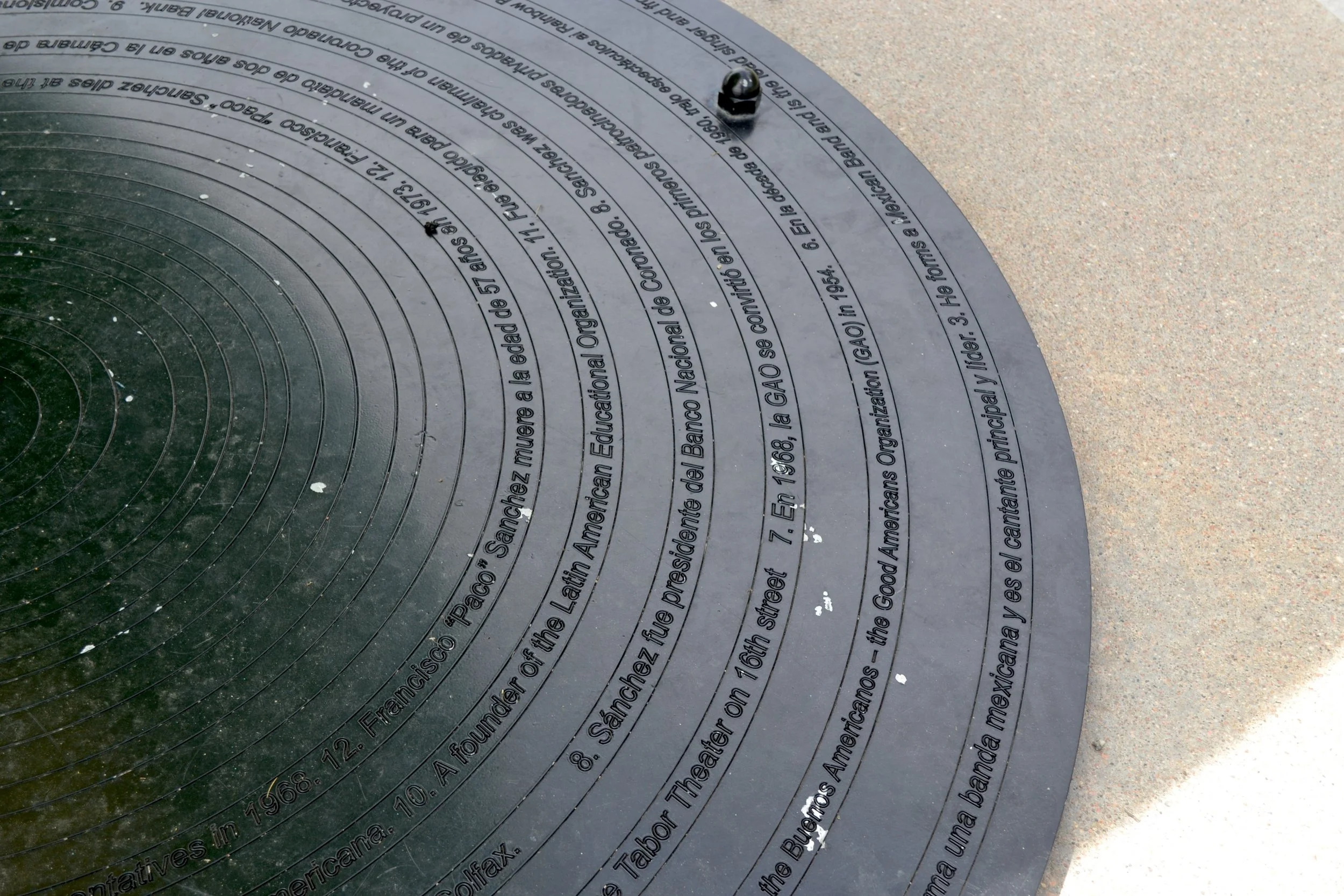 The grooves of each record depict line engravings of the ever-changing city skyline that he helped shape. At the base of the sculpture, Frésquez provides more insight into Sanchez’s life. A spiraling timeline, beginning with his birth in Guadalajara, reveals that his story could fill the surface of many more records still.