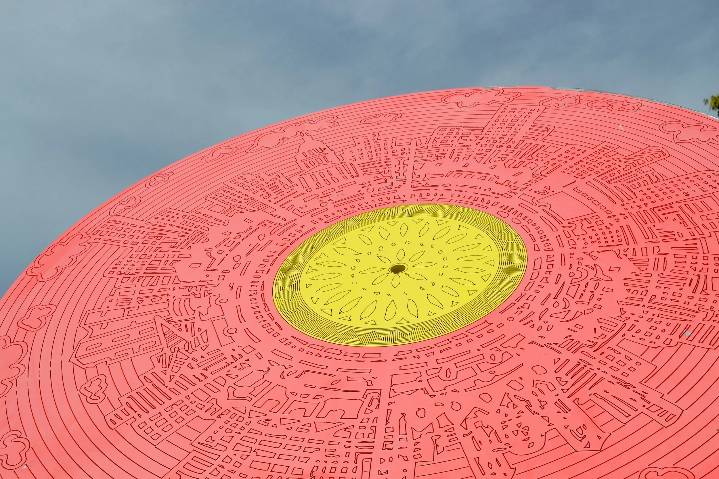 A detail view of the red record in Carlos Frésquez’s sculpture Que Viva Paco featuring a sunflower motif at the center. Image by Paloma Jimenez.