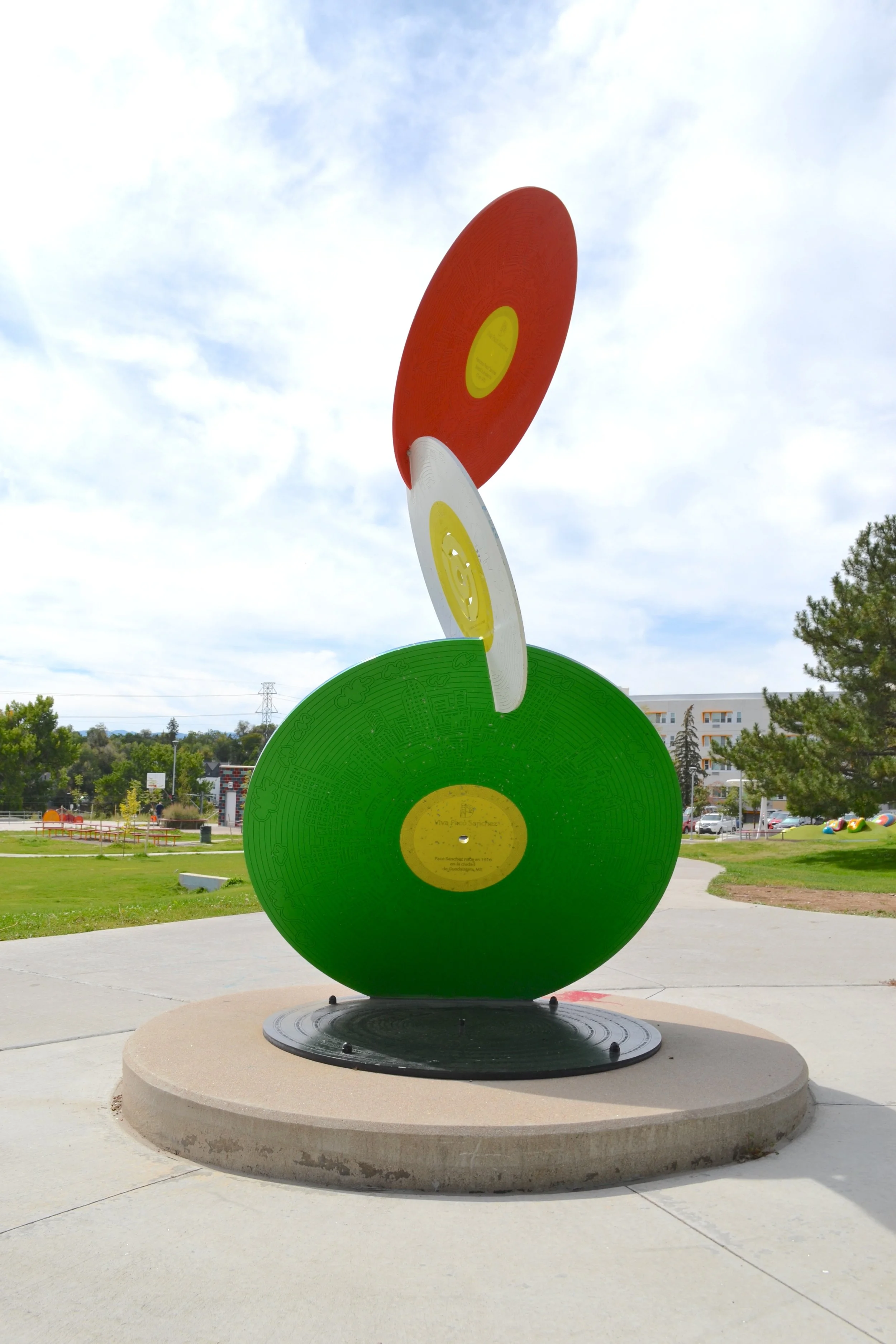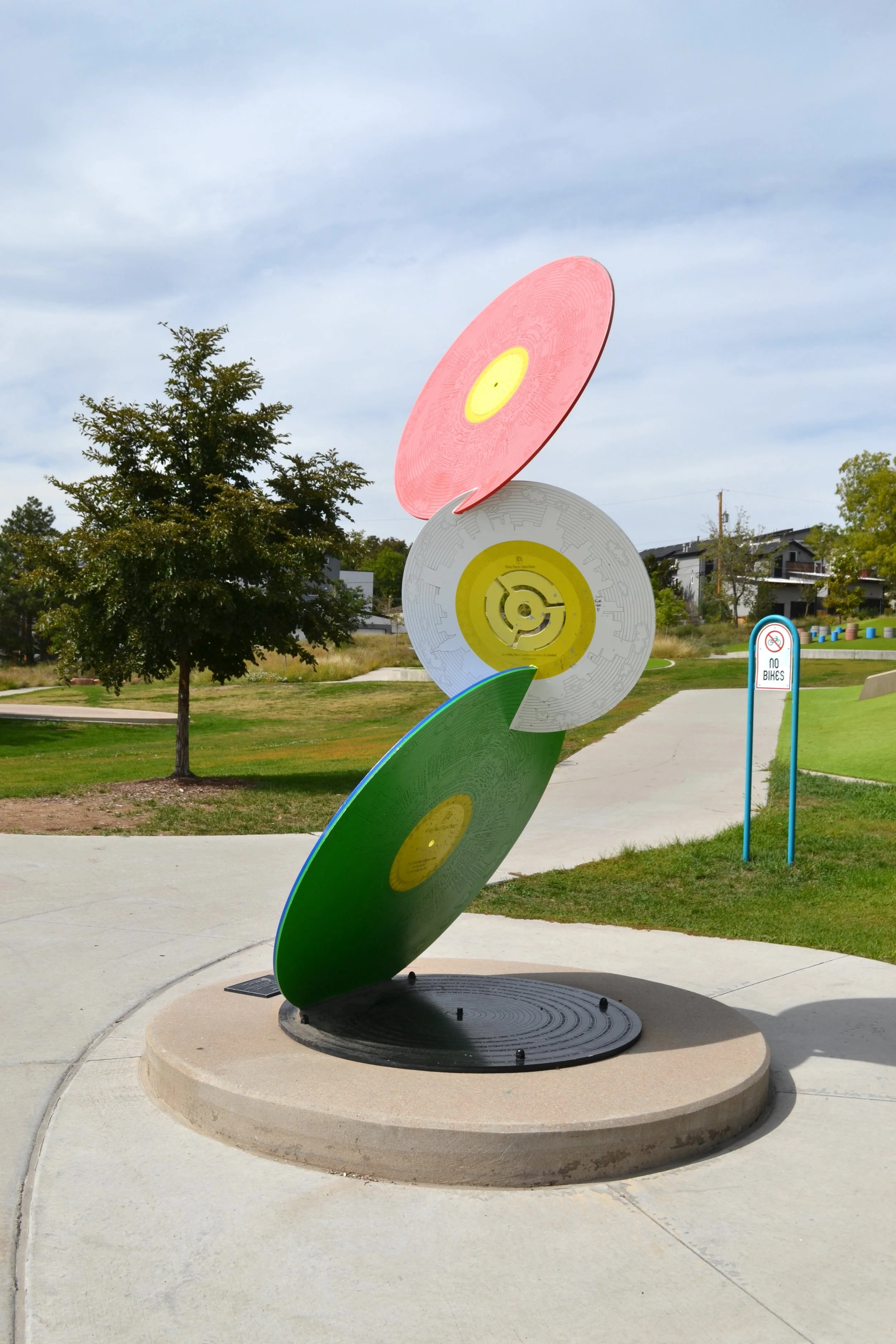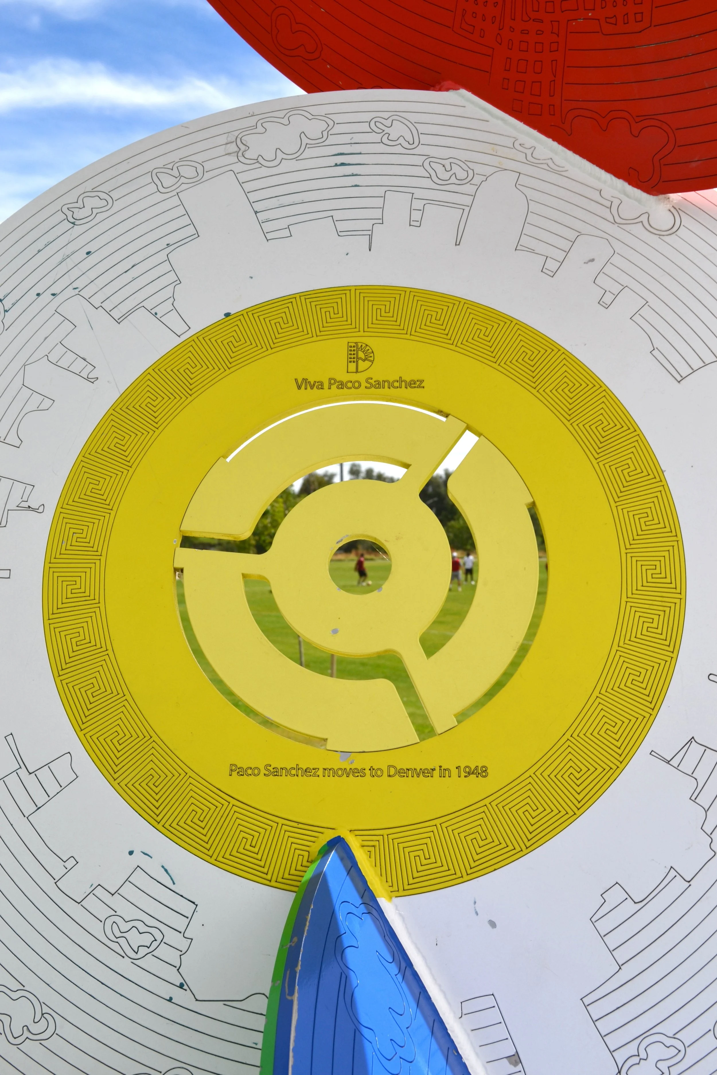 Paco Sanchez Park, named after a vital member of the community who in 1954 brought Denver its first Spanish language radio station, buzzes with inviting energy. The park’s design honors his legacy, featuring a microphone shaped playground tower, music note footholds, a bridge adorned with tinkling chimes, and rolling hills reminiscent of sound waves. Joyous shouts from the playground and soccer field provide a lively soundtrack. In the middle of it all, the steel sculpture Que Viva Paco by Carlos Frésquez spins the story of Francisco “Paco” Sanchez’s legacy.