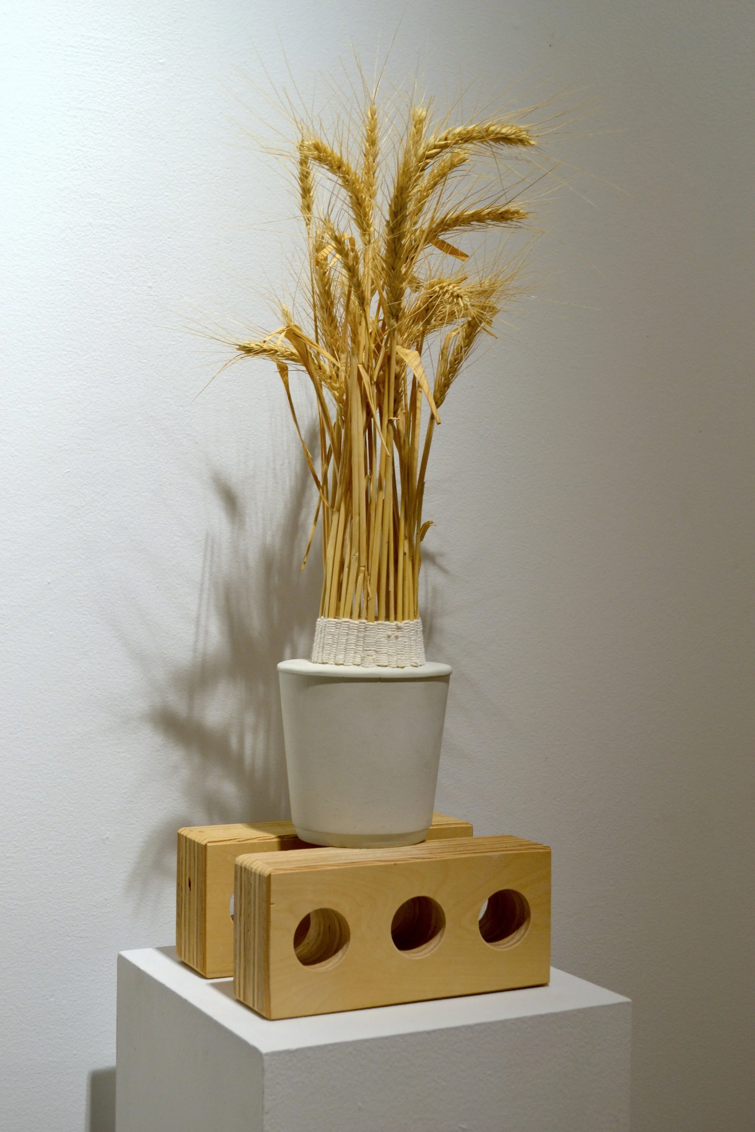Eleanor Sabin, Yard Waste, 2025, concrete, wheat stalks, cotton string, and plywood, 18 x 8 x 8 inches. Image by Paloma Jimenez.
