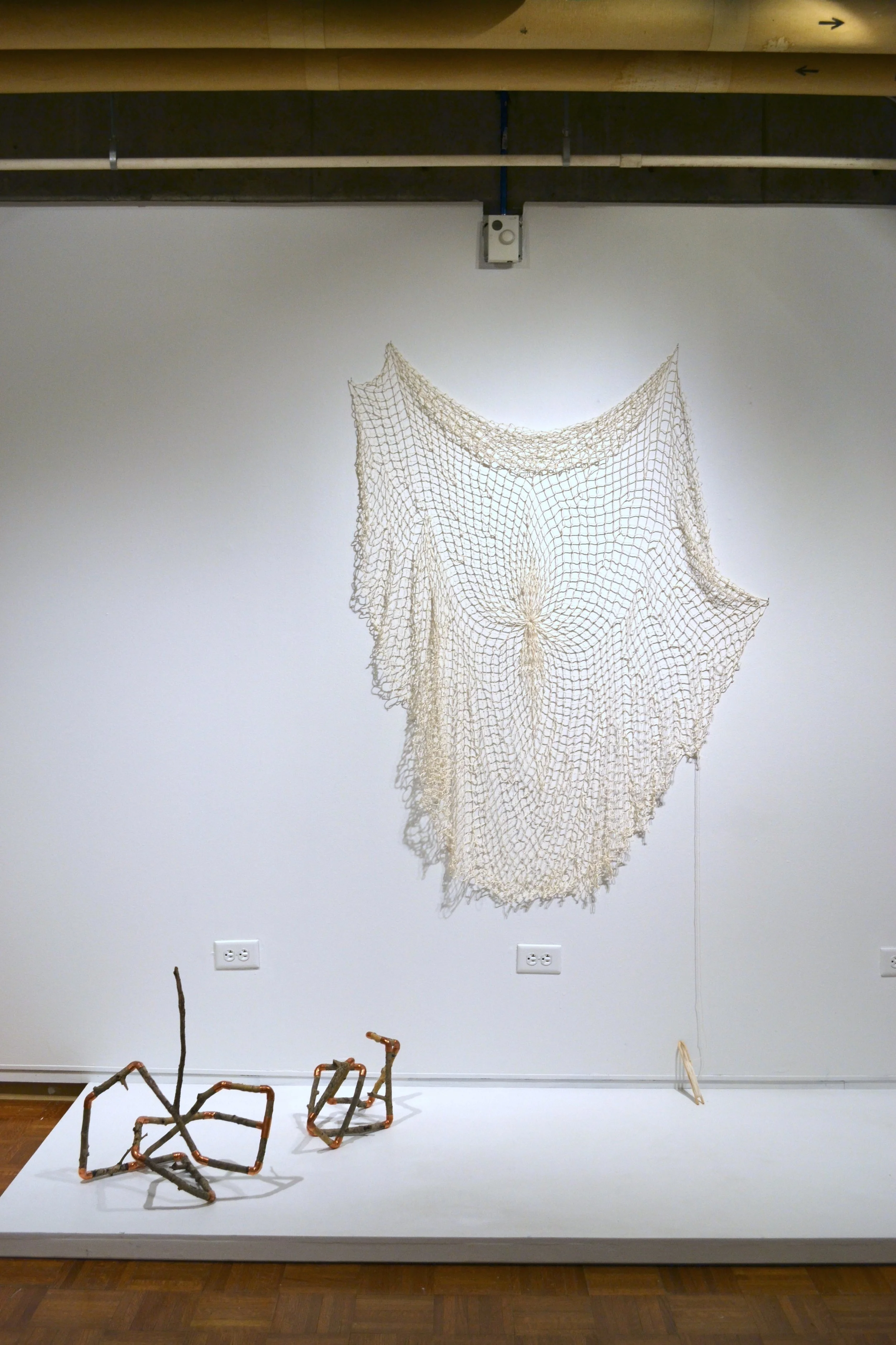 In the background: Eleanor Sabin, Shadow Net (Nap Net), 2026, cotton string and maple, dimensions variable. In the foreground: Eleanor Sabin, Untitled (Twisty Sticks 1-3), 2024-26, sticks and copper pipe fittings, dimensions variable. Image by Paloma Jimenez.