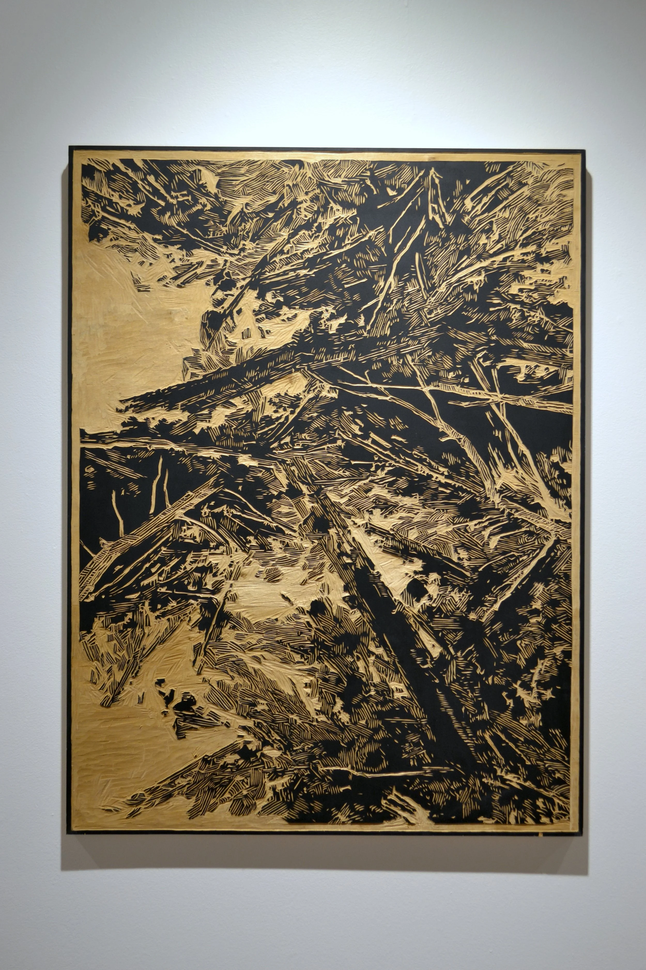 Genius Loci exudes a more joyful frenzy that can still be found in life’s entanglements. [1] Hatched lines carved out of the cherry plywood cluster together in a unified chaos. The orientation of this work remains unclear, whether it’s a skyward view through trees or a pile of branches on the forest floor, but the perspective happily rests somewhere in the thick of things.