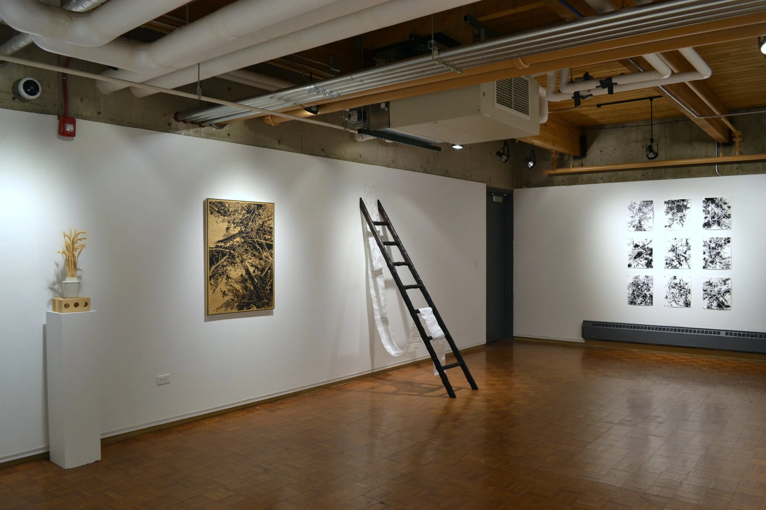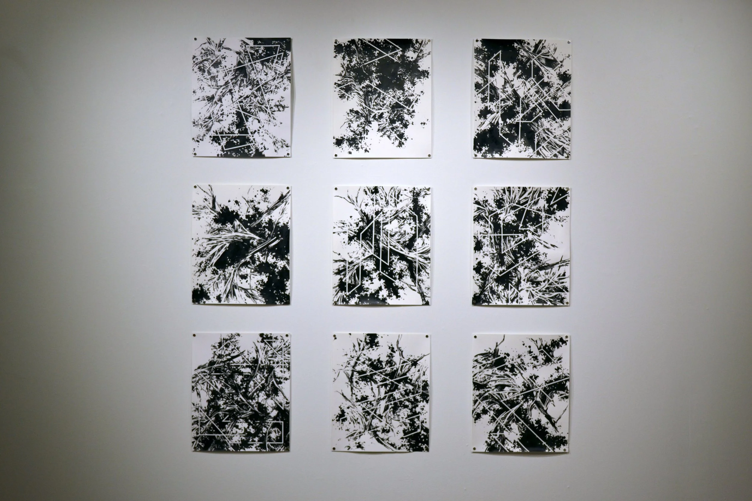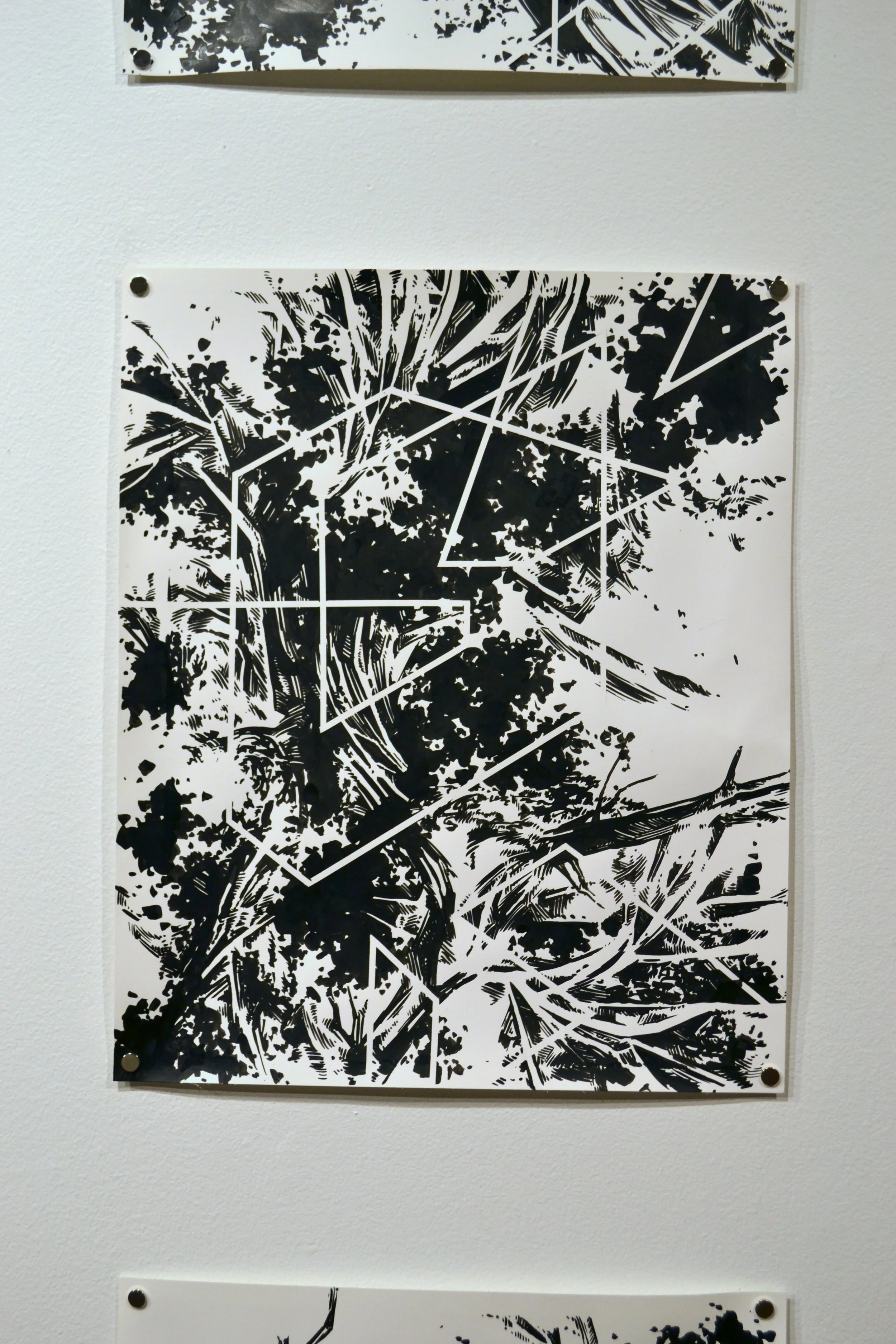 A group of ink drawings on paper, Growth Series 1-9, also explores the disruption of wildness. Lines of negative space run through splattered foliage patterns, as if mapping the untamed area for future construction. The stark contrast in Sabin’s two-dimensional work mimics the hunting pulse of a heatmap; indeed, the modern human approach to land is overwhelmingly predatory and extractive.