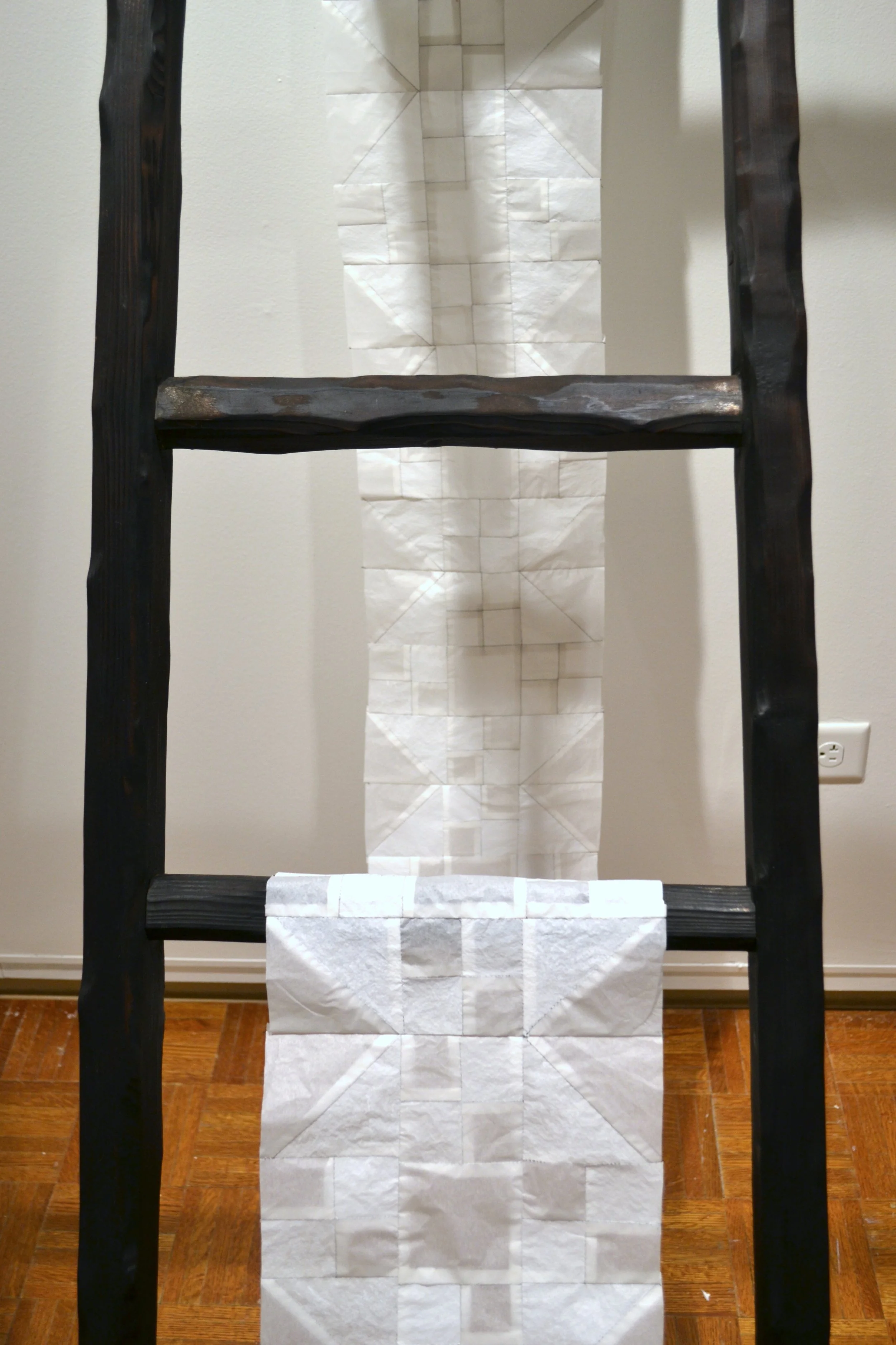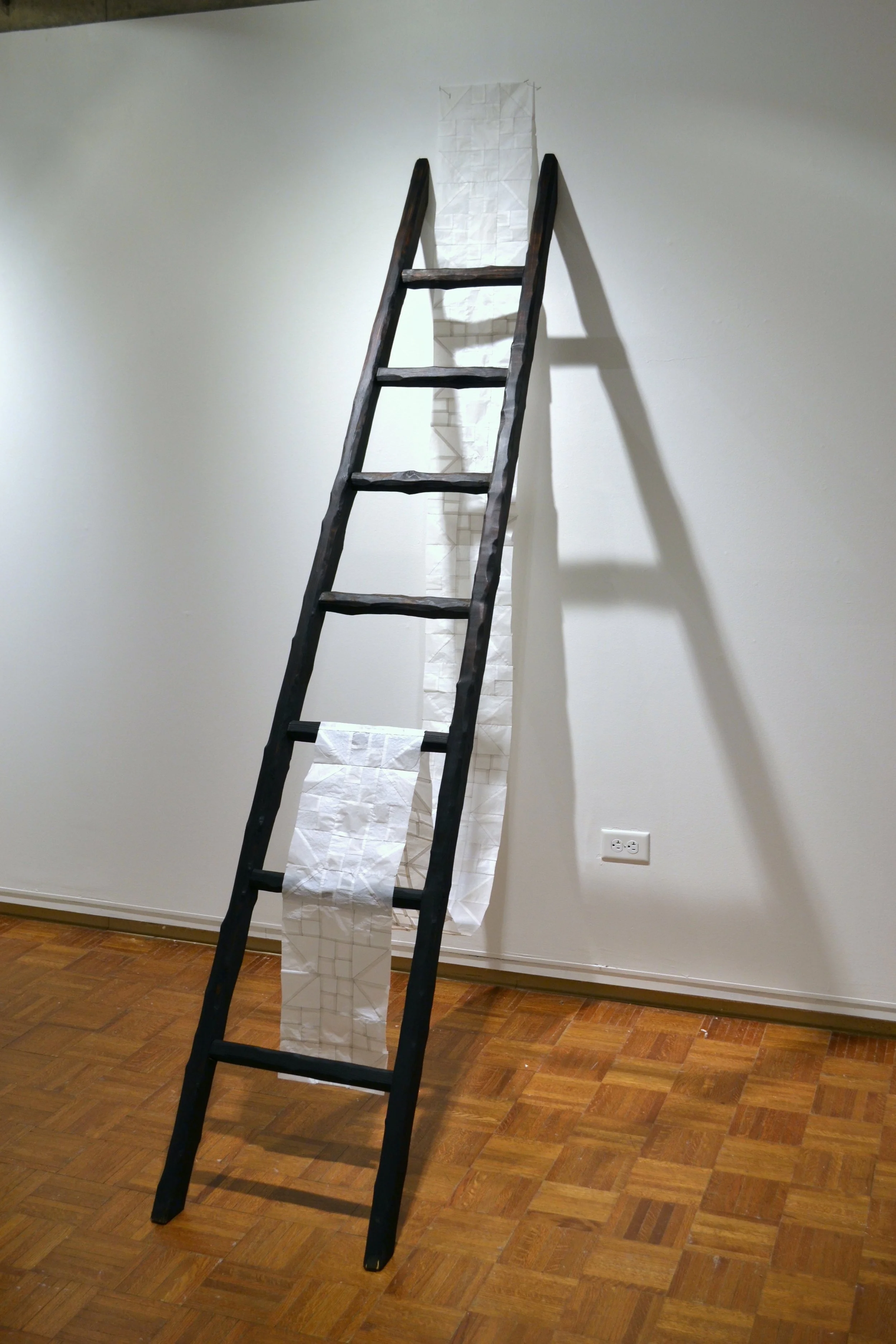 Ambition | Anchor sends the narrative vertical with a quilted paper scroll draped through the rungs of a charred ladder. The delicate lines of the paper seem to rely on the solidity of the ladder to hold up their lengthy progression. Their shadows intermingle. While the title offers clues to the symbolic meaning of the sculpture, the lasting resonance of the piece lies in the felt sense of reciprocity.