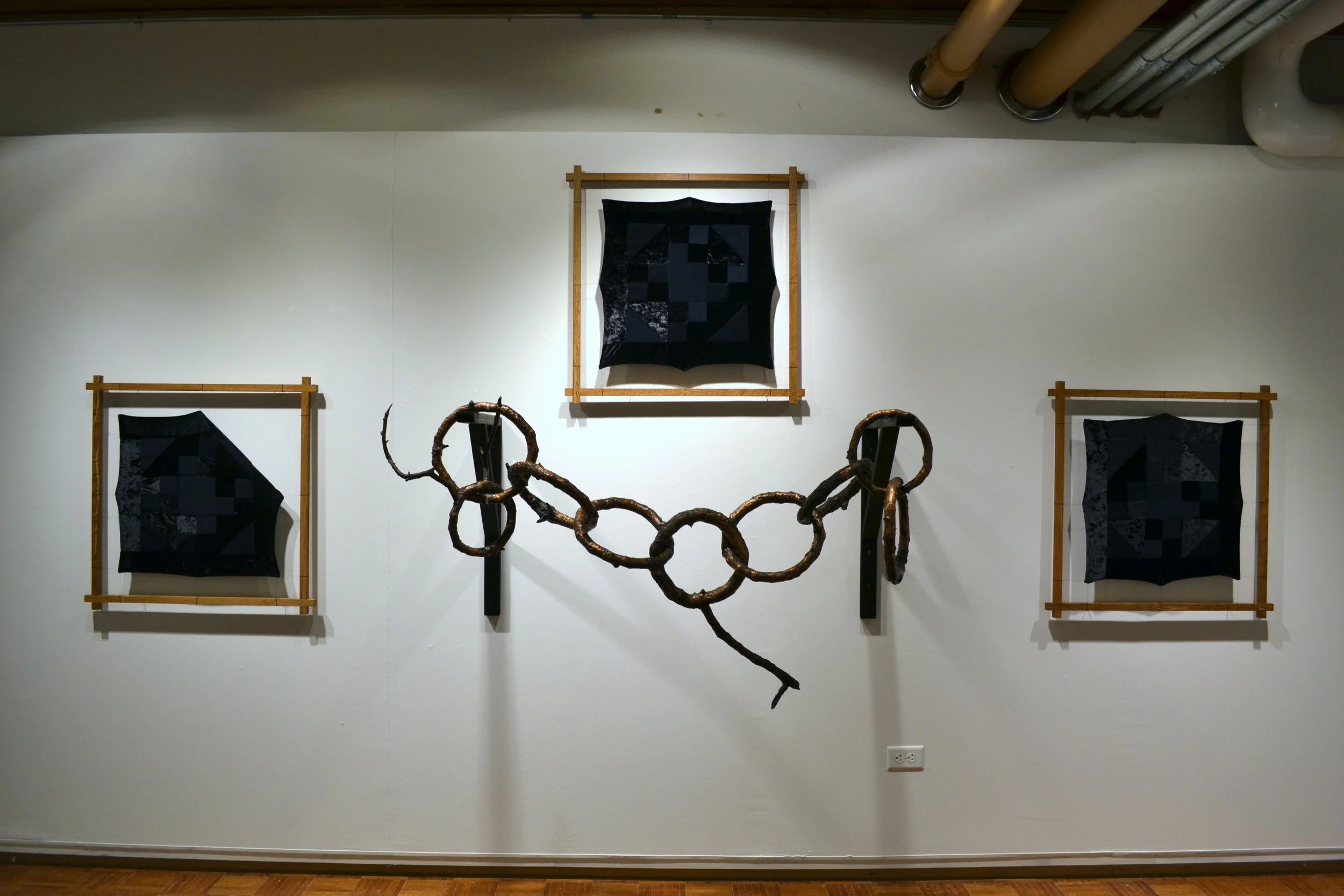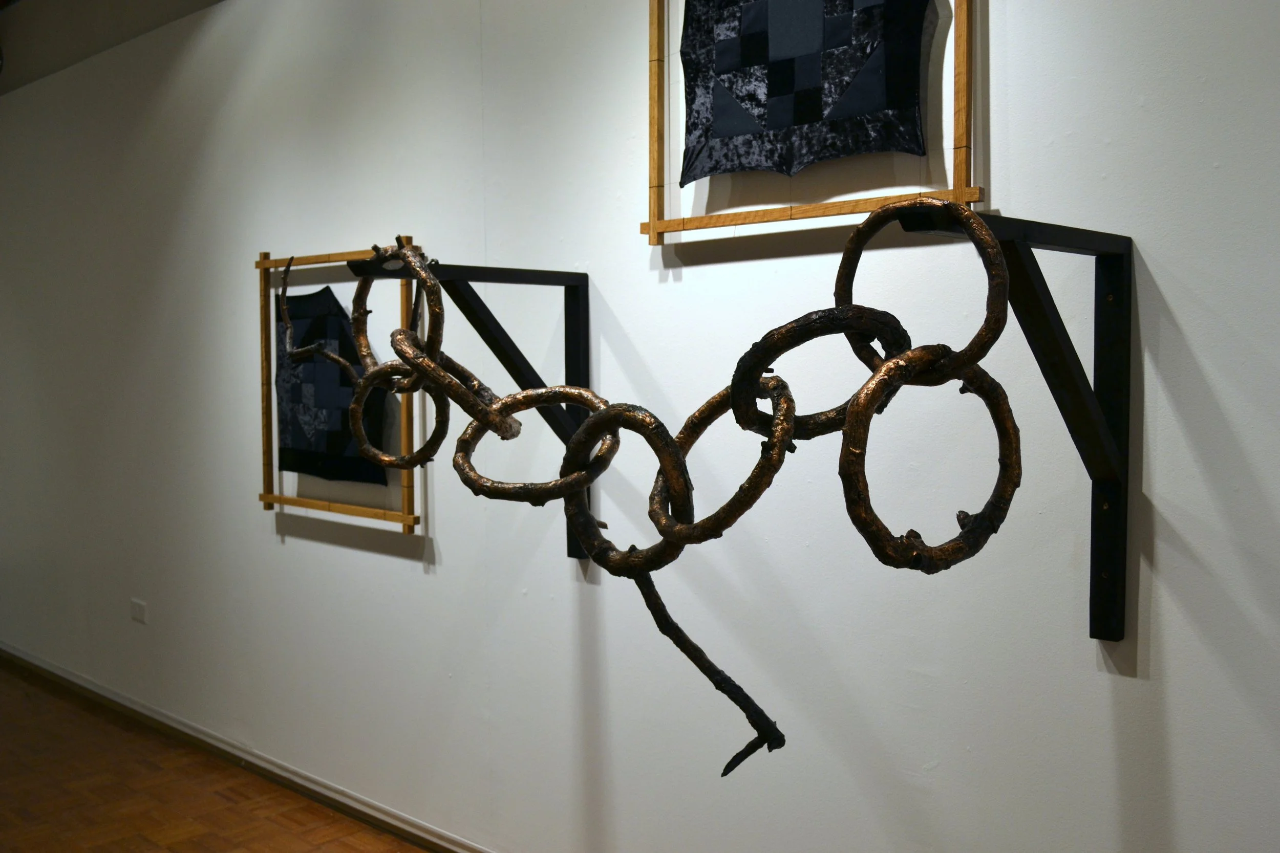Sabin further explores the poetic potential of shadows in Lineage, an installation that includes interlocked rings of branches and black quilts. The improbable branch links, glinting with a coppery patina, represent the bonds between family members—each branch of the family tree grows its own gnarled trauma and glimmering memories. [2] Fractures are always possible, but shared history also fortifies a family. Surrounding the links, three small piecework quilts—a medium historically used to record family and social narratives—of velvet and upholstery fabric stretch inside their frames as if flayed to reveal an underlying story.