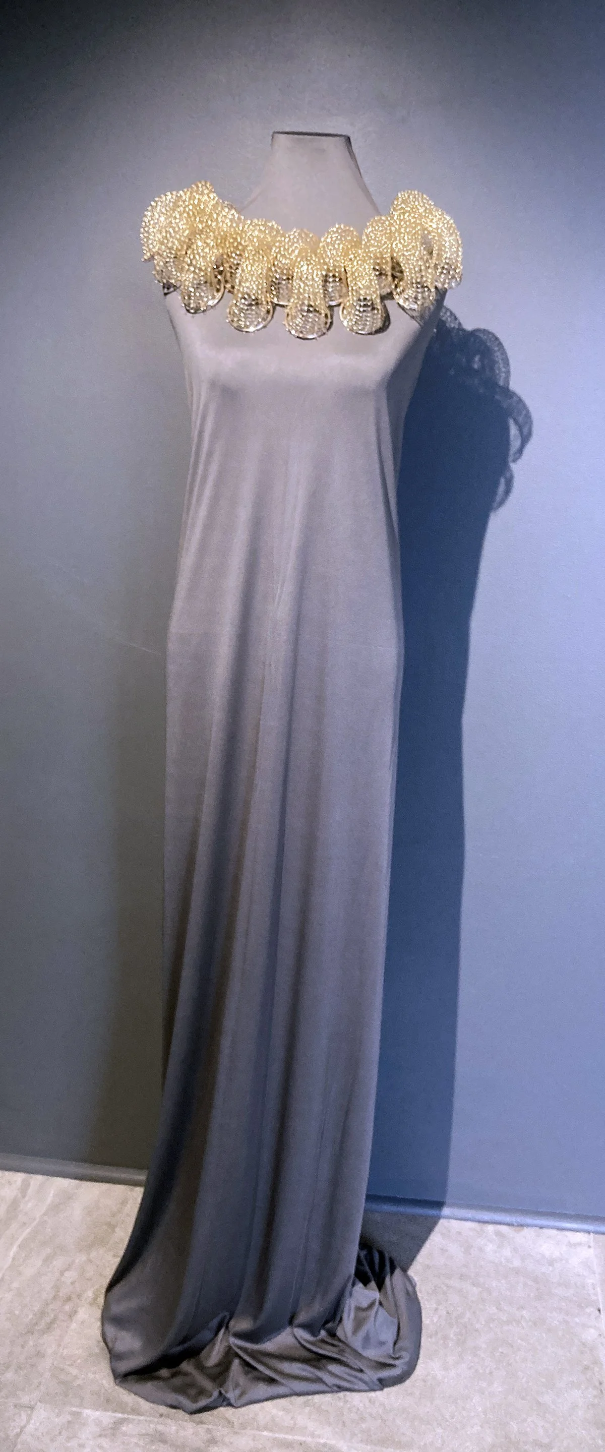 In contrast, Spiral Knit Neckpiece employs a different formal language. As its title suggests, it is constructed from spirals intricately configured into a wearable form. Echoing the structural presence of Elizabeth Collar, this gold-enamel-coated ornament extends across the chest with tubular forms that simultaneously evoke fuzzy cacti, coiled springs, and industrial scrub pads. Biomorphic and mechanical, substantial yet weightless, the work exemplifies Mathes’s capacity to generate provocative contradictions—objects that operate in multiple conceptual registers simultaneously.