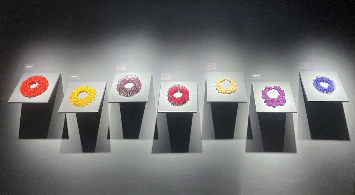 Seven works by Jesse Mathes, from left to right: Elizabethan Partlet: Orange, 2005, enameled copper wire; Elizabethan Partlet: Gold, 2005, enameled copper wire; Elizabethan Ruff, 2000, enameled copper wire; Elizabethan Ruff, 2000, enameled copper wire; Multiple Sphere Necklace: Gold, 2007, enameled copper wire; Spiral Necklace, Pink and Blue, 2024, enameled copper wire; and Boa, 2008, enameled copper wire. Image by Dani/elle Cunningham.