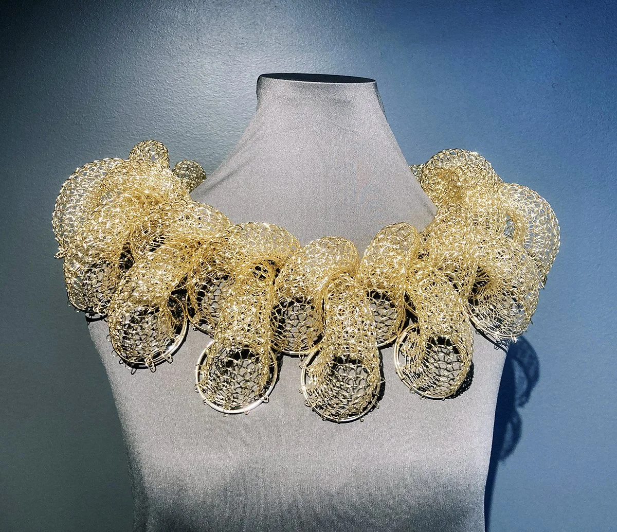 Three works by Jesse Mathes, from left to right: Lace Neckpiece: Orange, 2009, enameled copper wire; Multiple Sphere Necklace: Gold, 2017, enameled copper wire; and Elizabethan Lace Ruff, 2017, enameled copper wire. Image by Dani/elle Cunningham.