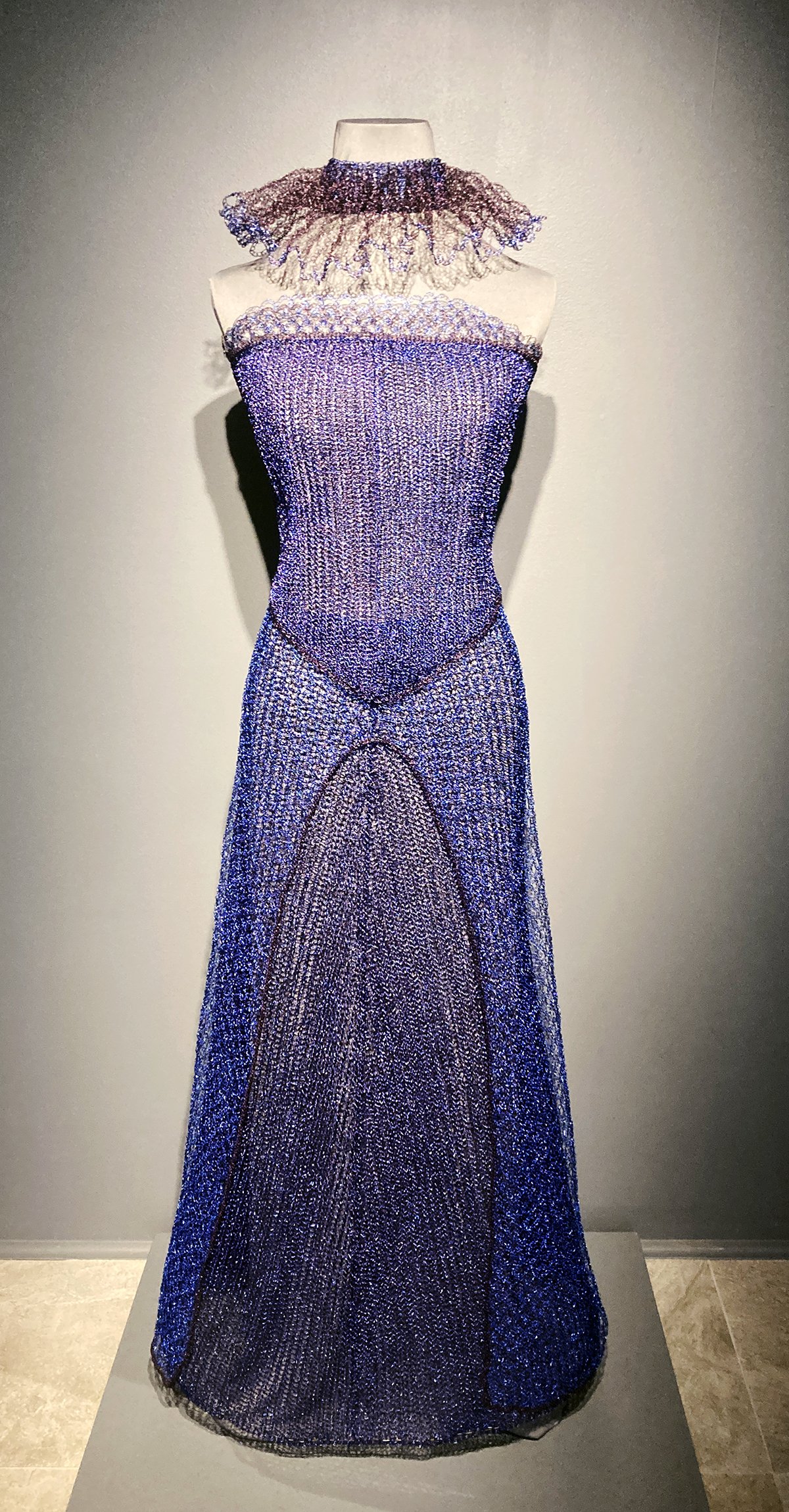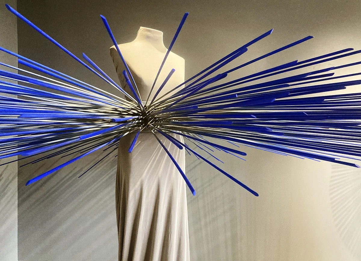 Serving as a bridge from the monumental section, Mathes’s floor-length, strapless blue metal Elizabethan Gown commands attention while distinguishing itself from the predominantly upper-body wearables elsewhere in the exhibition. The gown interrogates the concept of armor, reimagined for the court rather than the battlefield, challenging conventional understandings of form and function while acknowledging that courtly women, too, required and still require protection.