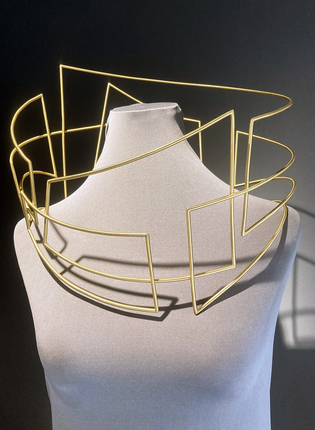Asymmetrical Geometric Neckpiece: Two extends Mathes’s engagement with the Elizabethan collar. Unlike her densely constructed “cage” works, this piece utilizes open spaces, permitting viewers to see the wearer’s body while still offering protection. Its design conveys both invitation and caution: the gaps suggest accessibility, while the angular forms create a subtle barrier, producing a tactile and conceptual tension.