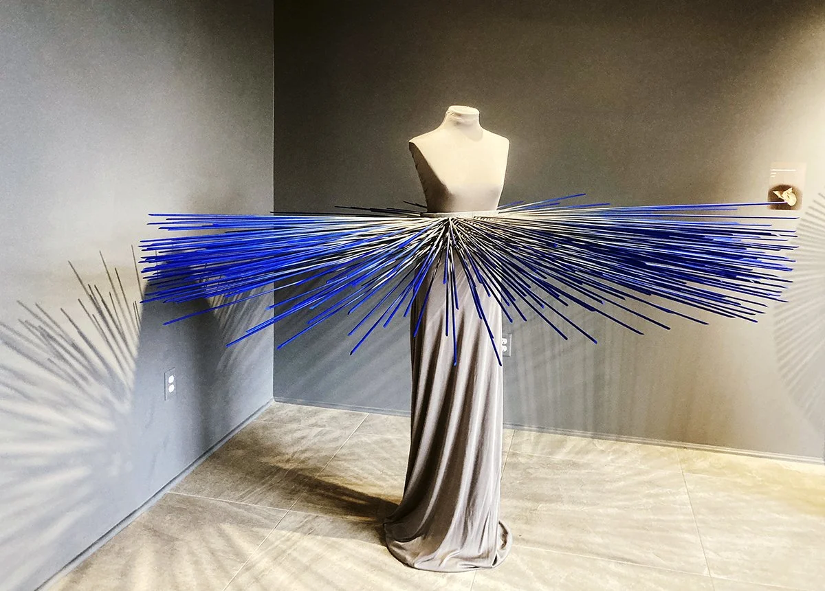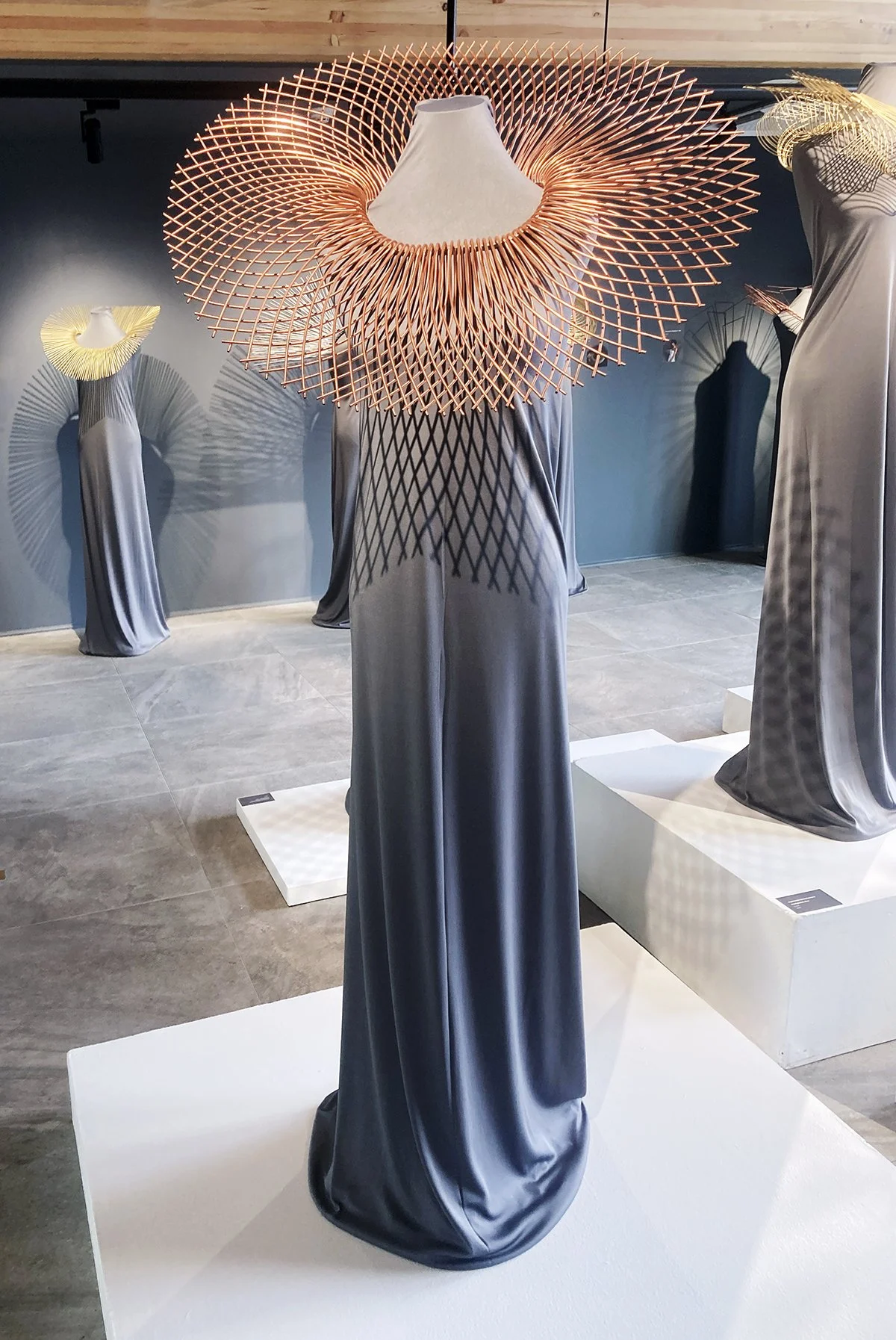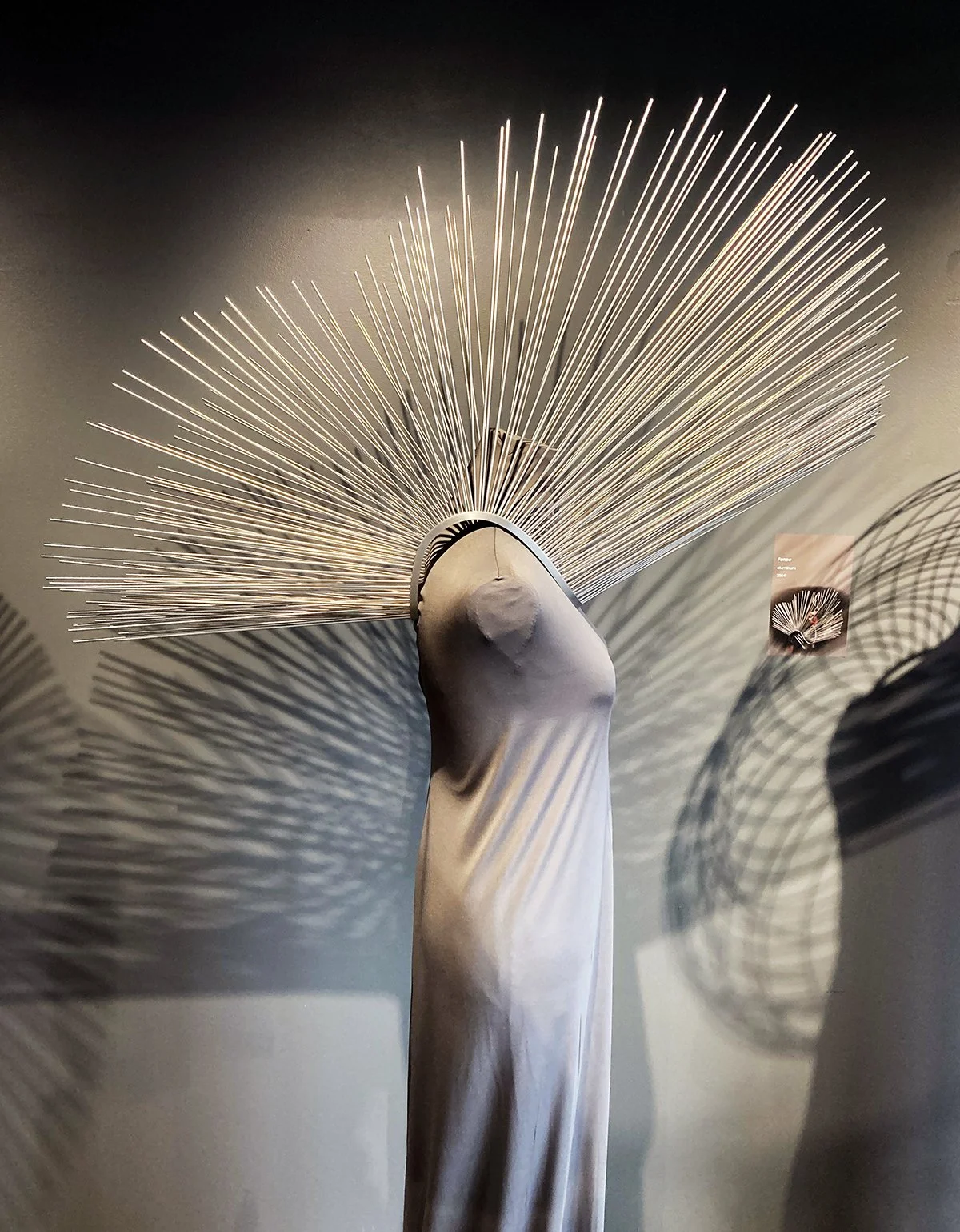 There isn’t an object in the exhibition that interrogates boundaries louder than Farthingale, one of the largest and most materially diverse wearables. Constructed from wood, pewter, magnets, and paint, this wearable features individual wooden elements that project more than a foot from the wearer’s waist, evoking porcupine quills or cactus spines.