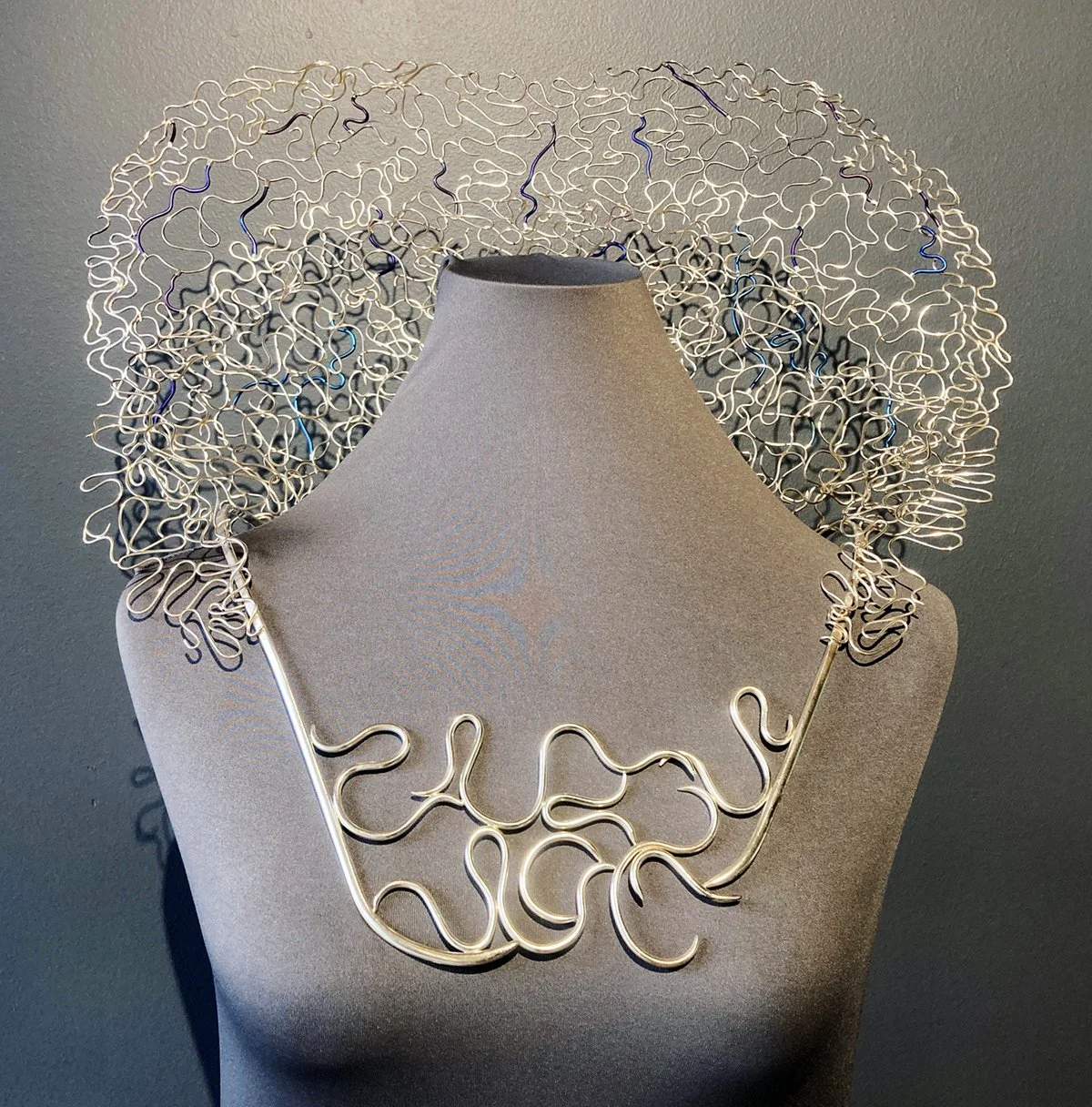 Jesse Mathes, Spiral Knit Neckpiece, 2021, sterling silver and silver-plated wire with clear enamel coating. Image by Dani/elle Cunningham.