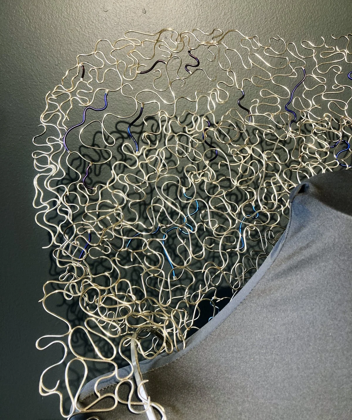 A close-up view of Jesse Mathes’s Spiral Knit Neckpiece, 2021, sterling silver and silver-plated wire with clear enamel coating. Image by Dani/elle Cunningham.
