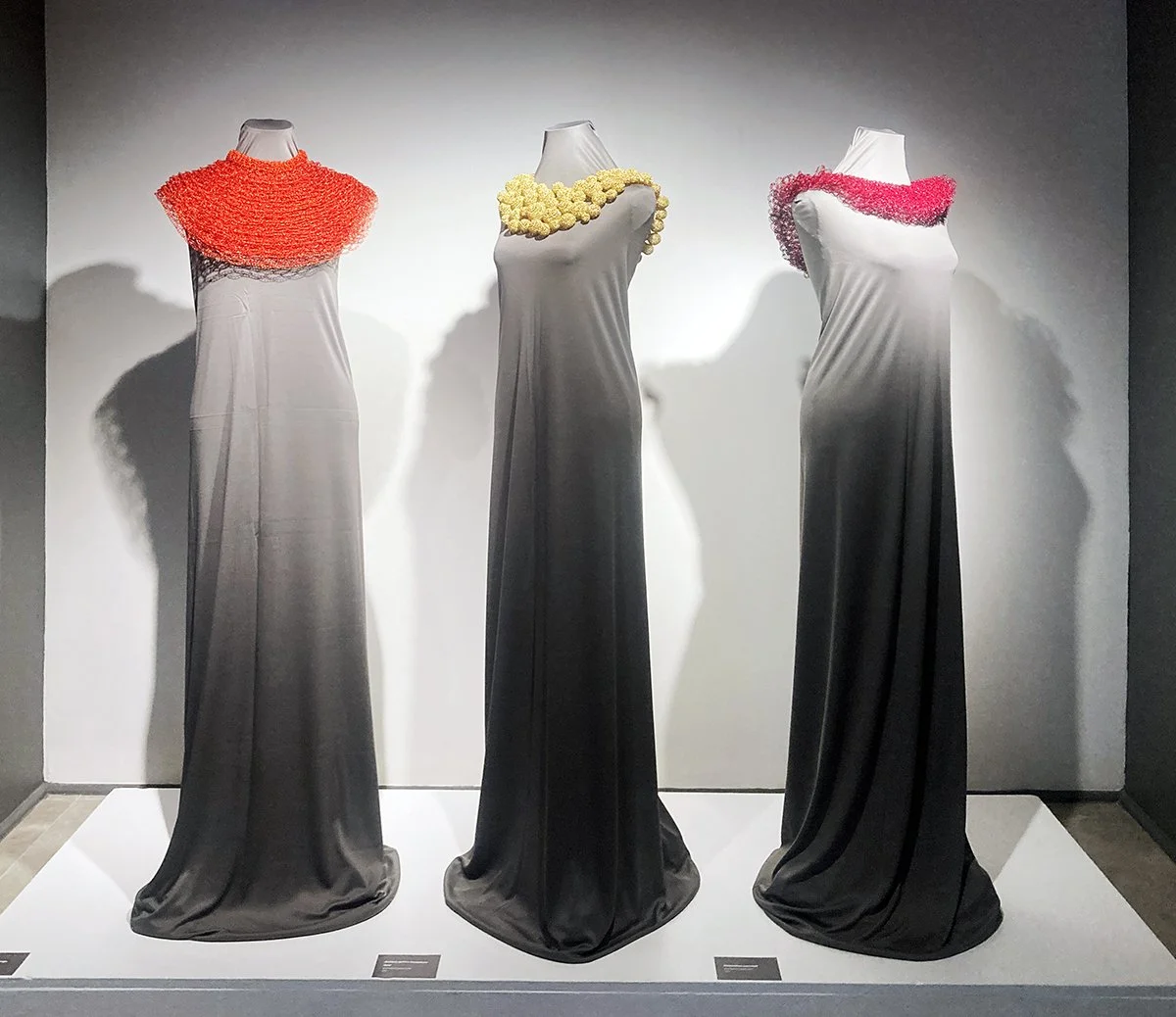 Mathes’s wearables may be understood in two categories: the monumental and the subtle. The smaller, less conspicuous wearables, positioned near the entrance, are primarily neck adornments reminiscent of collars. They convey the artist’s restraint and draw inspiration from nature, evoking plants, nests, and animal eggs.