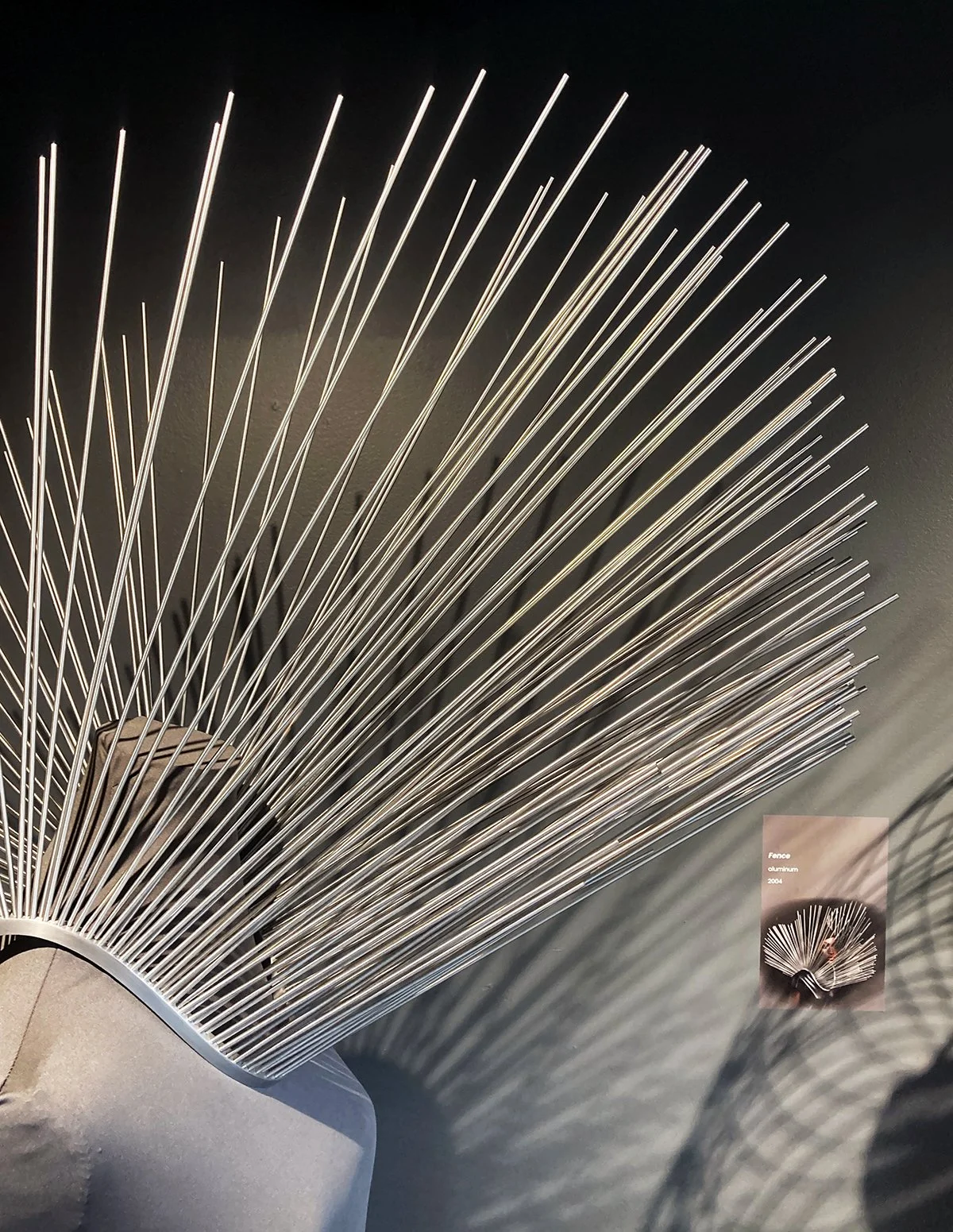 Fence forms another dramatic wearable, consisting of thin rails or spikes encircling the wearer’s head. Cast in muted gray, the work emphasizes sculptural form over color, blending subtly into the environment. The spikes extend naturally from the wearer’s shoulders, suggesting that it is an extension of the body while also functioning as a literal protective barrier. It establishes a zone of defense around the wearer, warding off aggression and transforming the body into a site of both visual and conceptual authority. Even the shadows it casts evoke tension and intrigue.