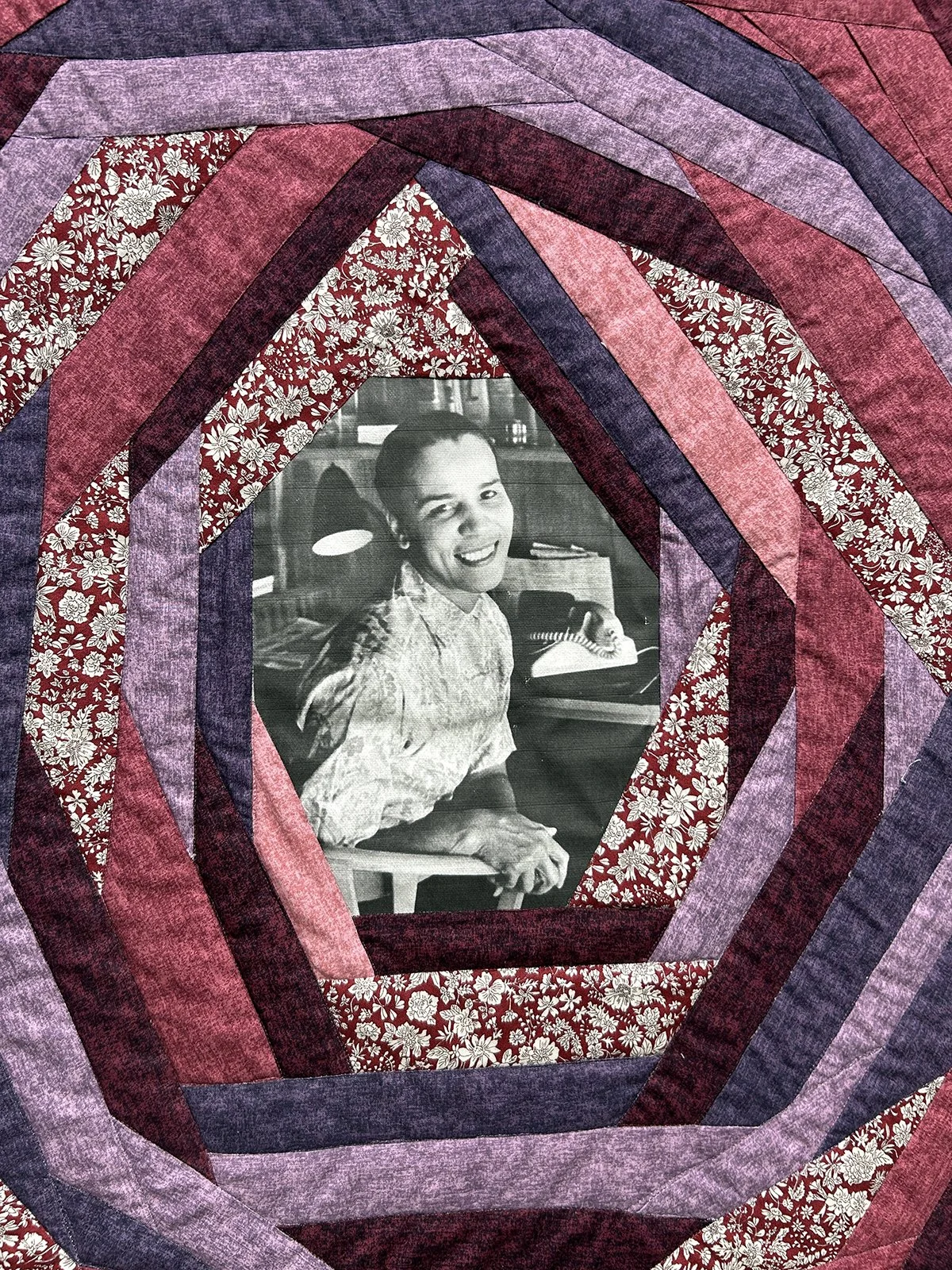 Seven of Ellamaria Foley-Ray’s quilted works featuring family photographs. Image by Brandy Coons.